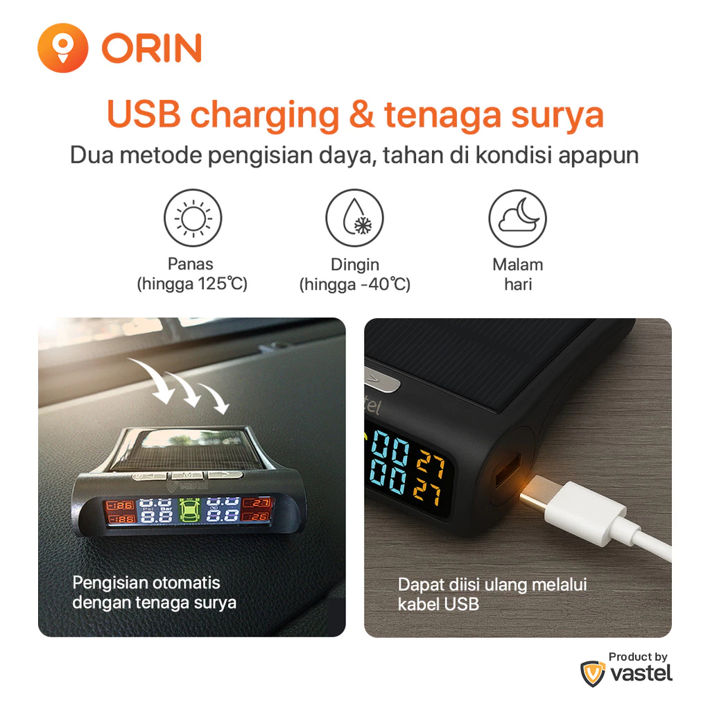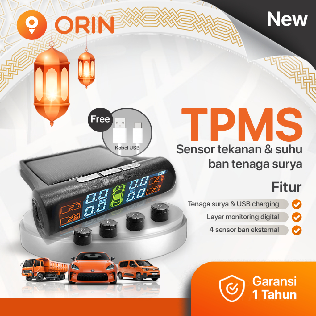 ORIN Solar TPMS Wireless Monitor - Pembaca Tekanan & Suhu Ban Mobil Tenaga Surya Alarm Anti Kecelakaan