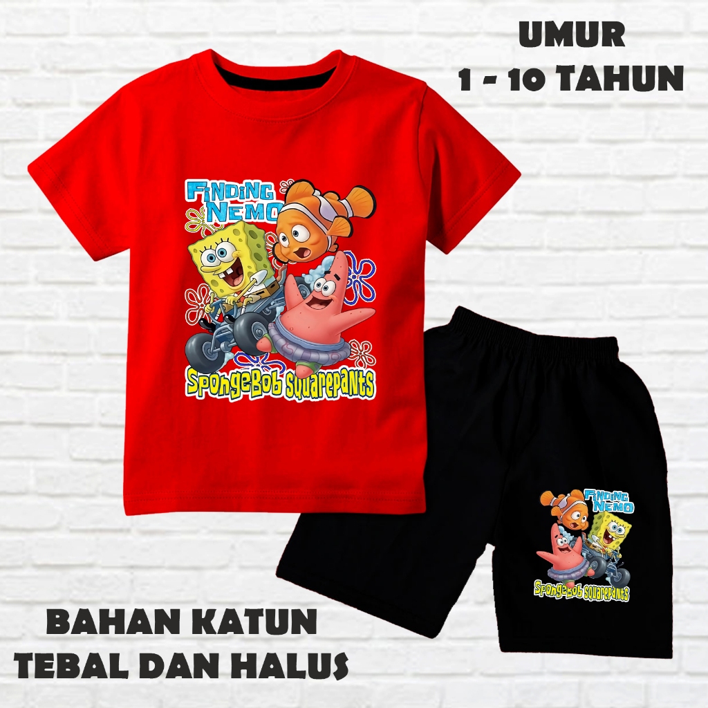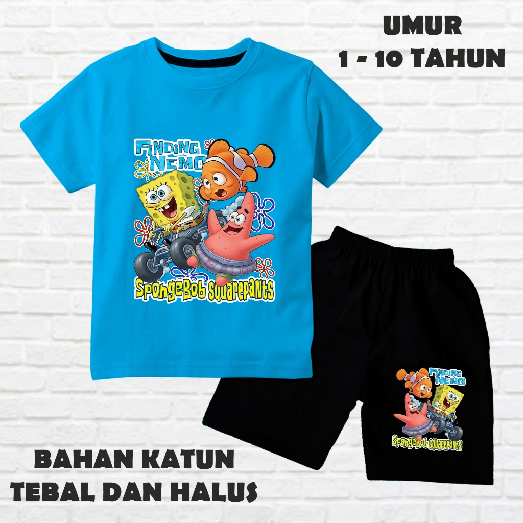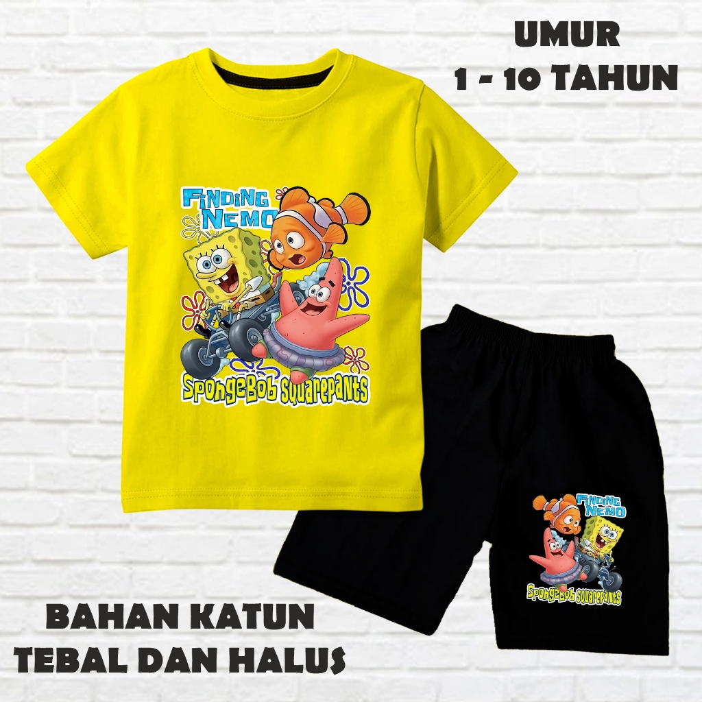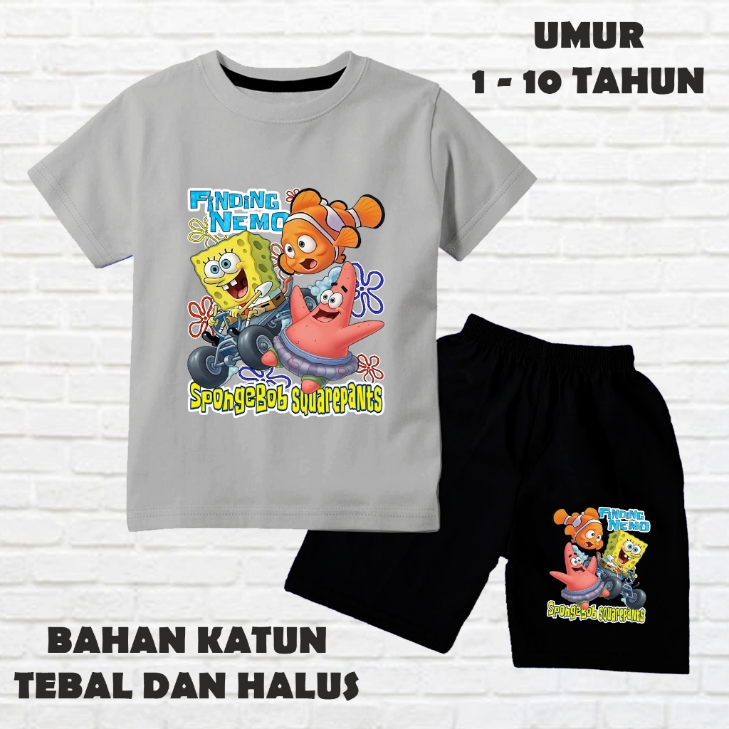Setelan lengan pendek anak laki laki perempuan motif ikan nemo & spongebob bahan katun premium sablon DTF cln hitam