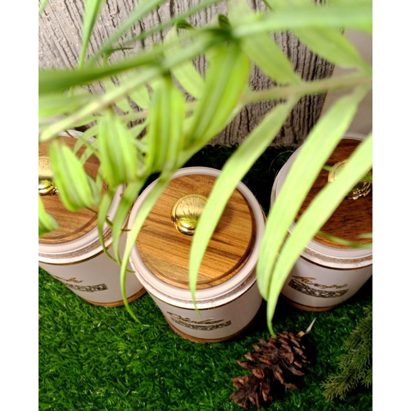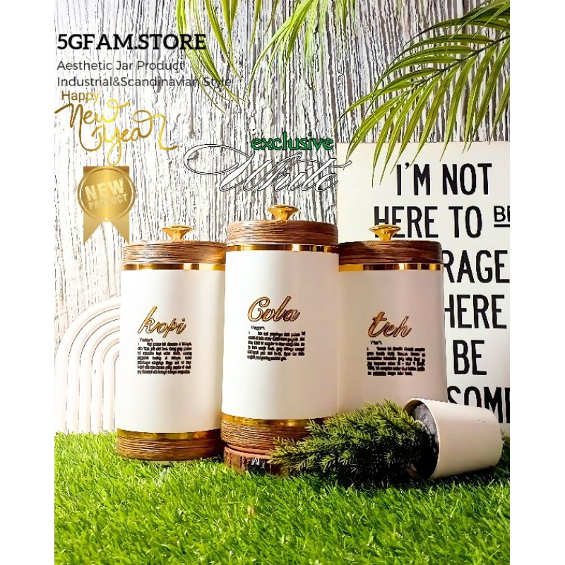 Premium Gold Toples 1000ml Aesthetic Estetik Gula Kopi Teh Plastik HDPE Bergaya Eropa dengan tutup kayu jati dan Tarikan Stainless Steel Kitchenware Dapur Wadah Gold Keranjang Ekslusif Warna Putih