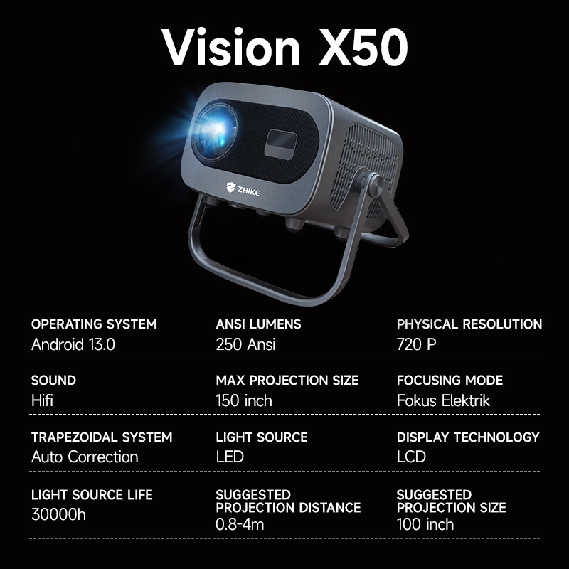 ZhiKe Projector mini Vision X50 Projector | Android 13.0 | 4K Decoding | Built-in Speaker & Microphone| Home Cinema Portable