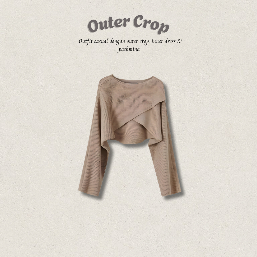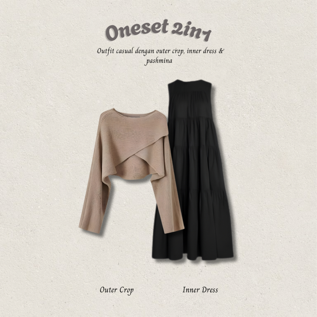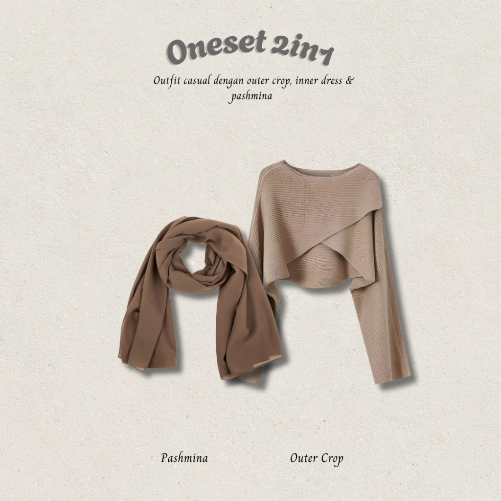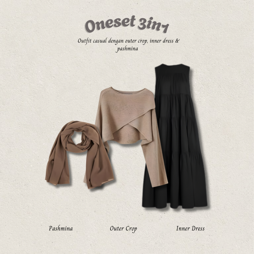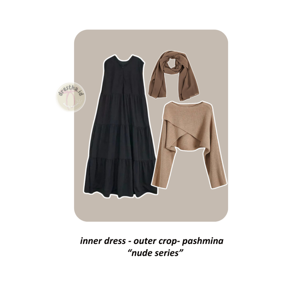One Set Hijab Kekinian 3IN1 ( Inner Dress Ruffle + Outer Crop Rajut Vest Cardigan Korean Style + Pashmina ) OOTD Nude Series | Outfit Simpel Ala Remaja Wanita DT59