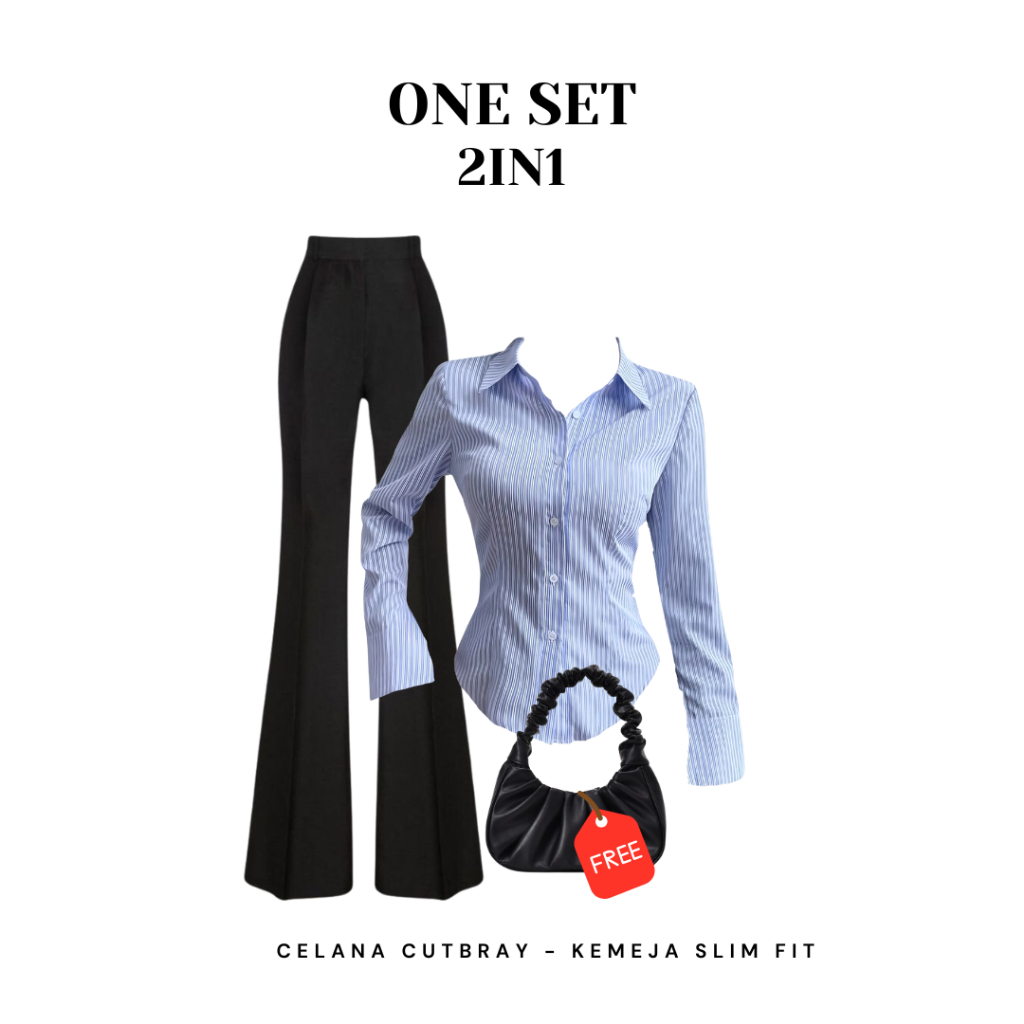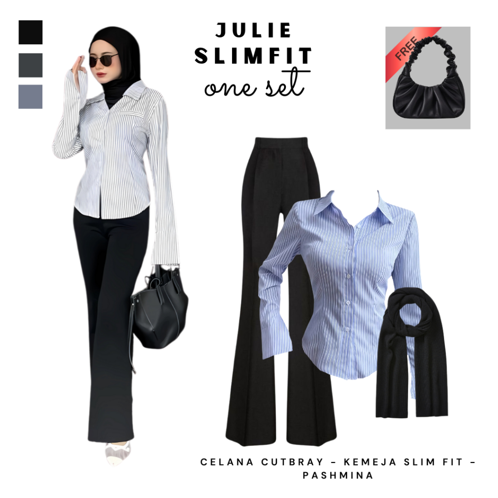 Setelan OOTD Wanita Kekinian (Blouse Salur Slimfit, Celana Cutbray Scuba, Pashmina Hitam) - CTO74