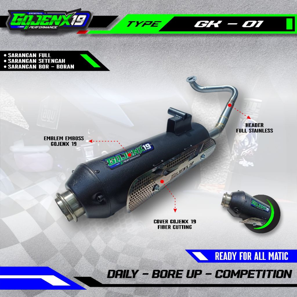 Knalpot Standar Racing Type GK-01 GOJENX19 PERFORMANCE Full System Tameng Stainless Leheran in 28/38 Suara Ngebas Adem Gahar Finishing Black Coating