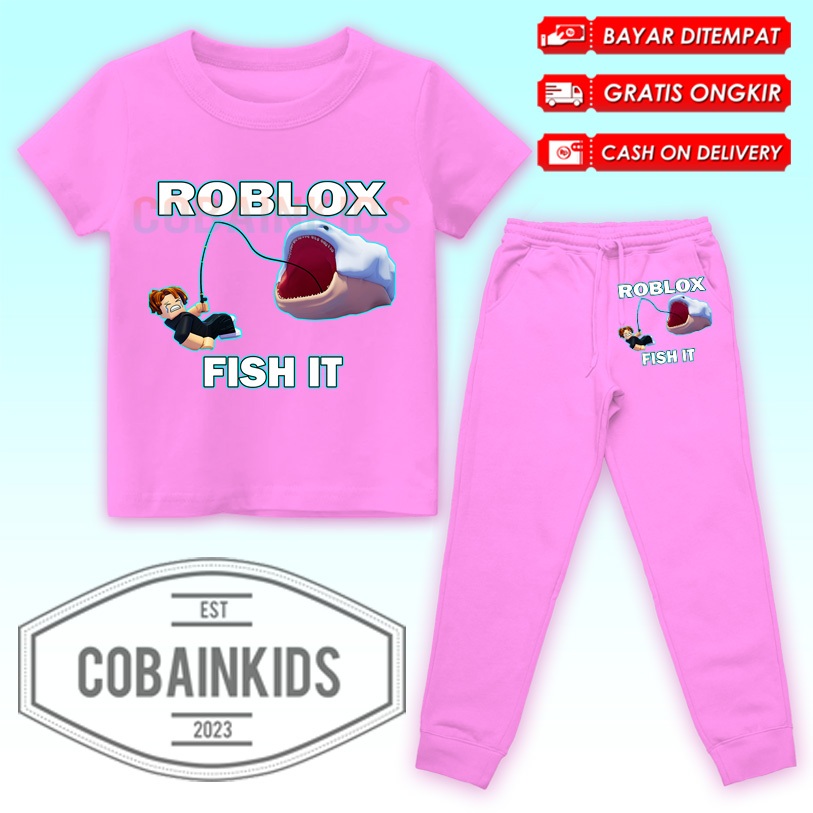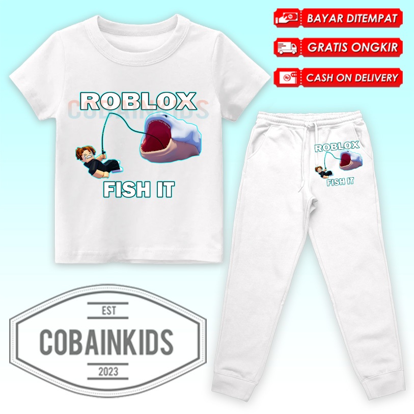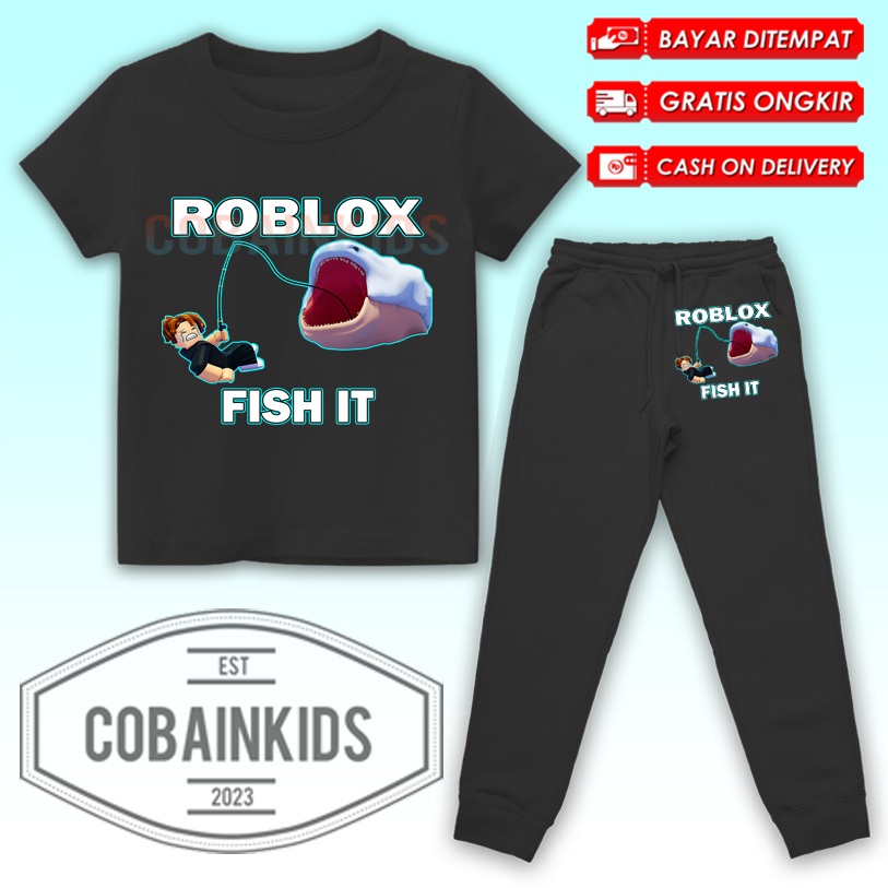 (BISA COD) Setelan Fashion Kaos Anak Karakter ROBLOX FISH IT Set Baju dan Celana Jogger ANAK ROBLOX FISH IT FREE NAMA