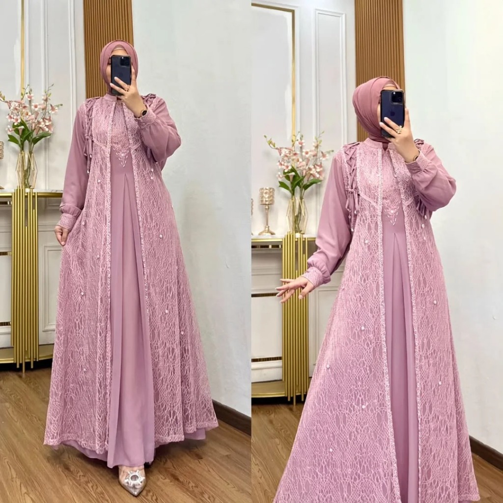 Fitri Dress Gamis Mahogany Brukat Pesta 2025 Gamis Ceruty Babydoll Mix Brokat Kondangan Mewah Elegan