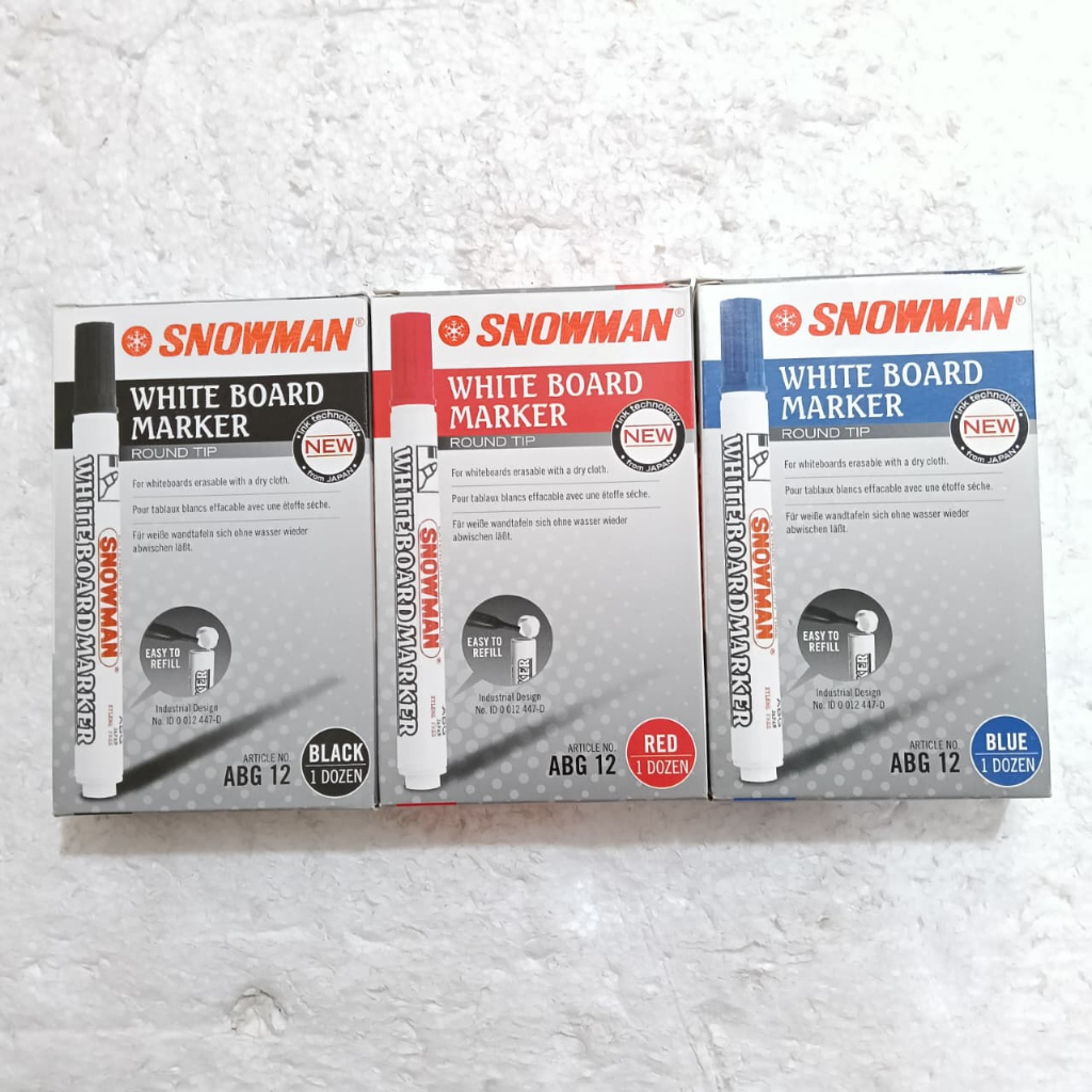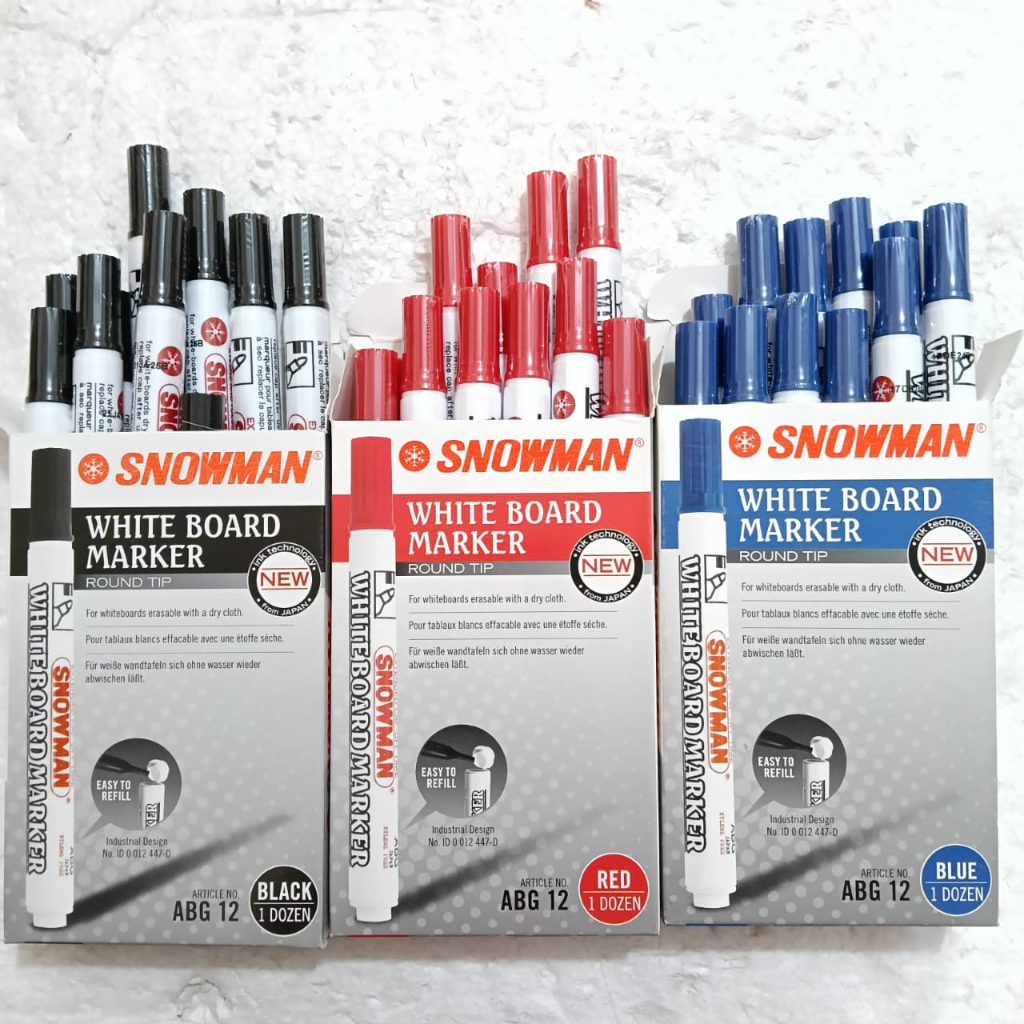 1 Kotak Spidol Whiteboard Snowman ABG‑12 Warna – Hitam, Merah & Biru