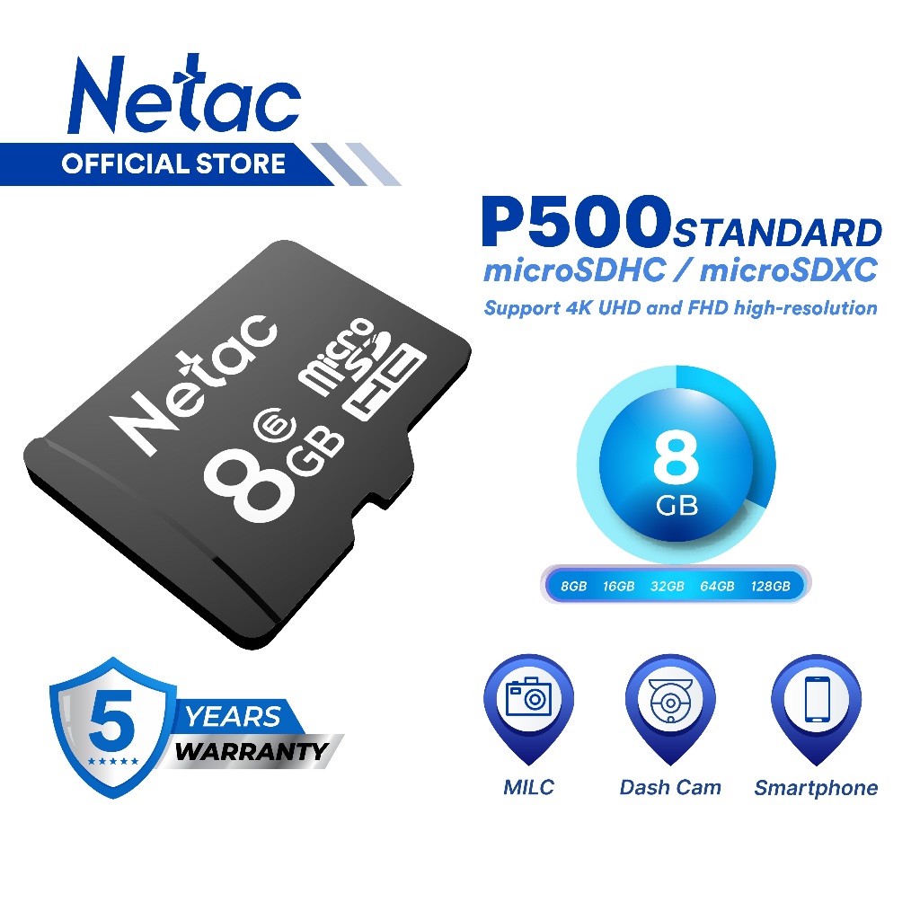 Netac MicroSDHC P500 Standard 8GB MicroSD Card up to 20MB/s Class 10 Retail Pack Card