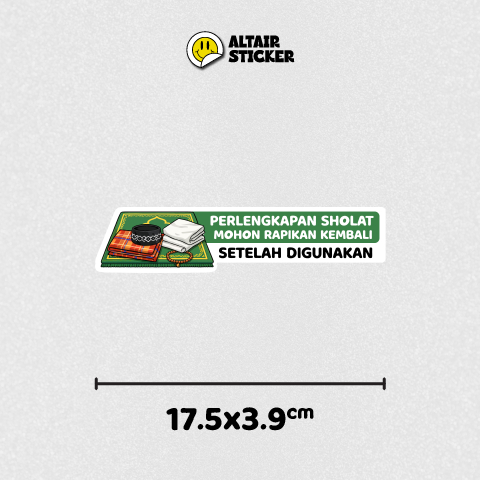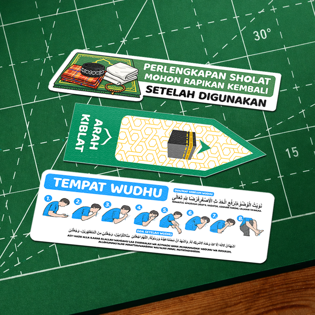 Sticker vynil sign mushola karakter lucu rapikan kembali peralatan sholat, arah kiblat, dan tempat wudhu