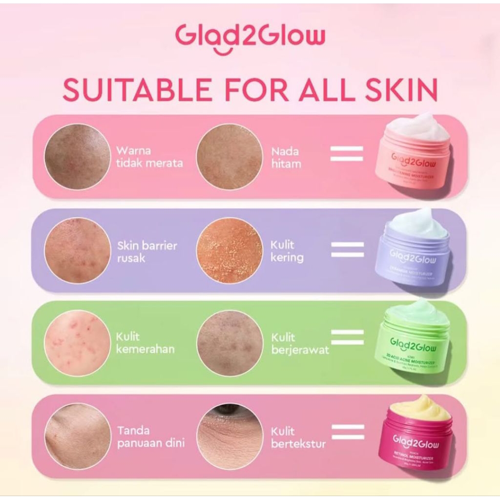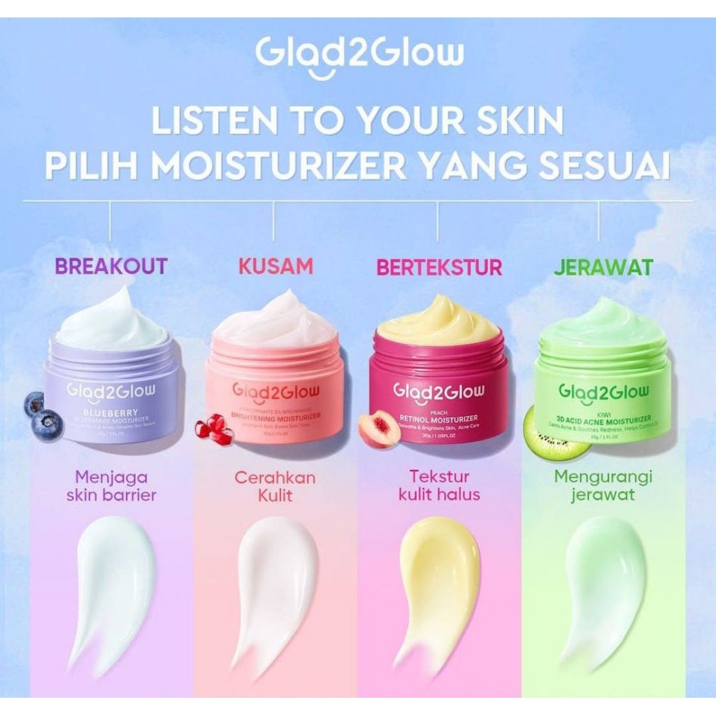 GLAD2GLOW Moisturizer Series 30gr | Moisturizer Retinol | Moisturizer Pomegranate | Moisturizer Blueberry | Moisturizer Kiwi | Moisturizer untuk Jerawat dan Kulit Berminyak | Moisturizer Pencerah Wajah Glowing | Moisturizer Eksfoliasi