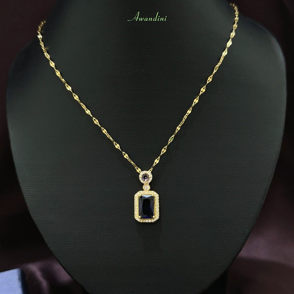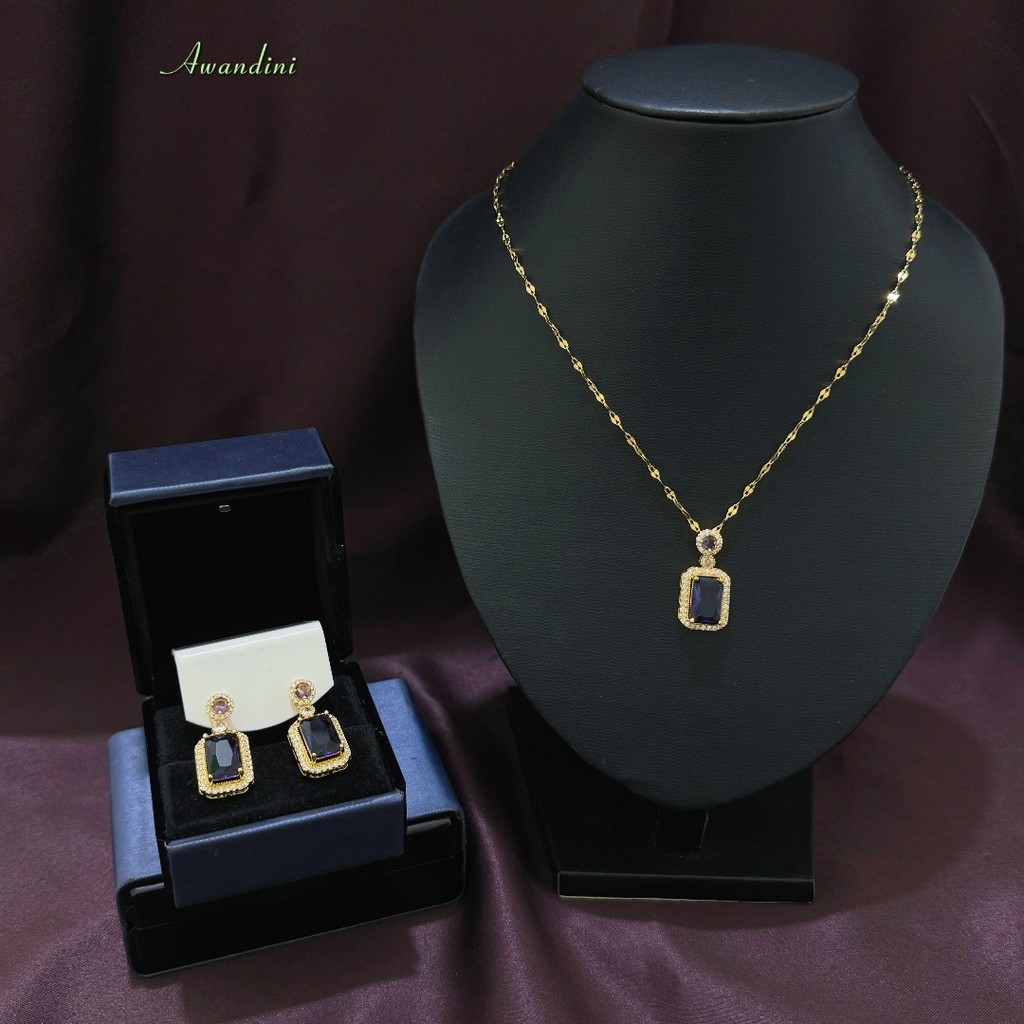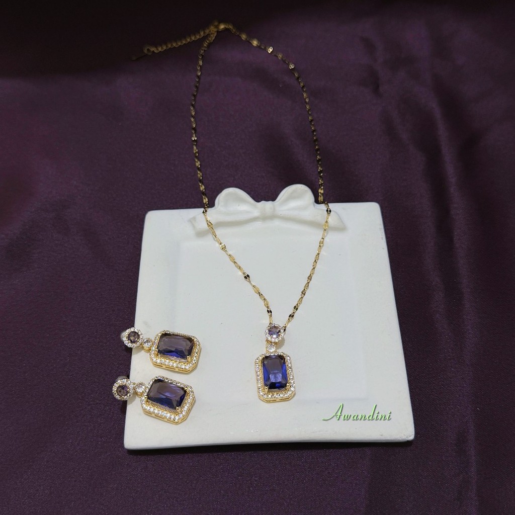 Anting Tusuk Batu Ungu dan Kalung Batu Kotak Ungu Liontin Bahan Titanium Cantik Elegan Awandini Jewellery