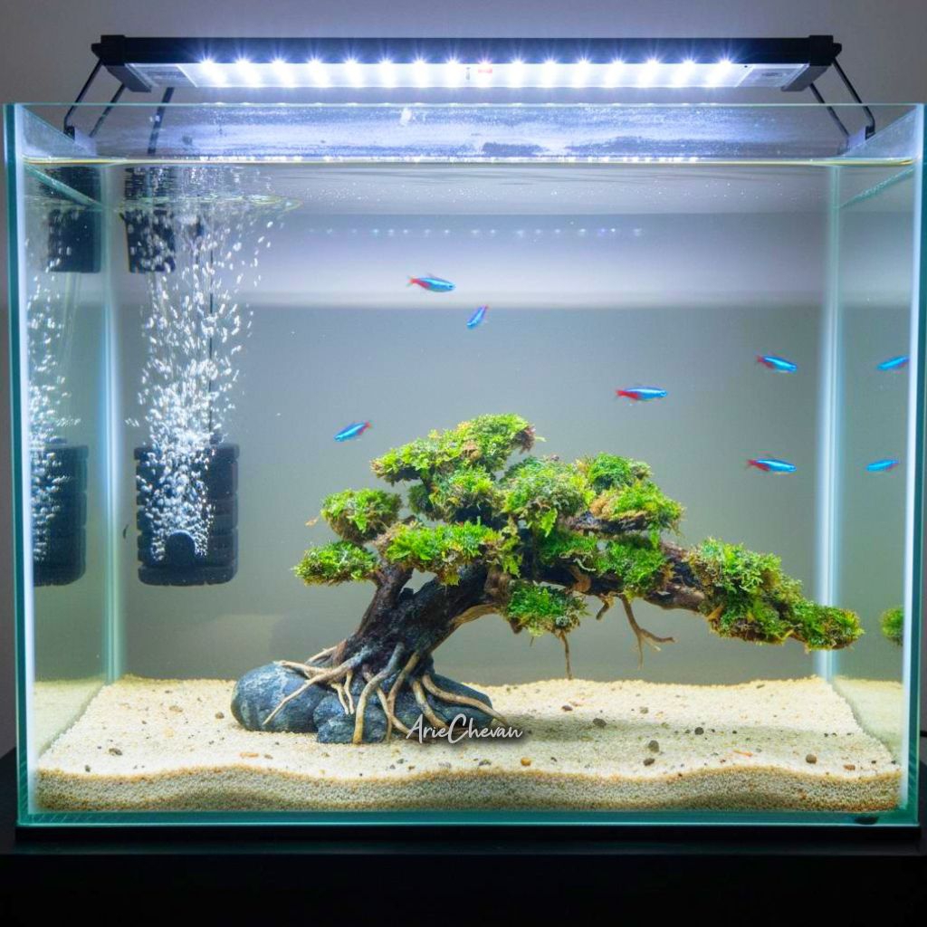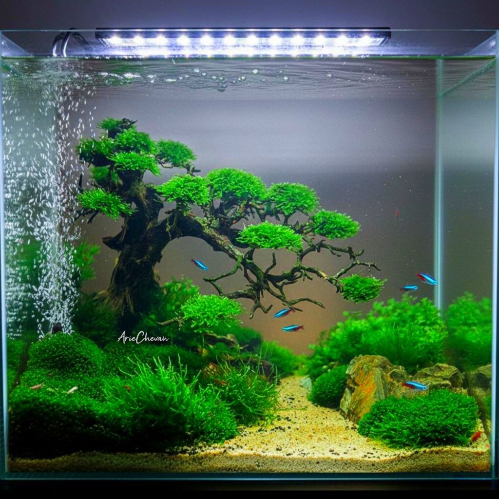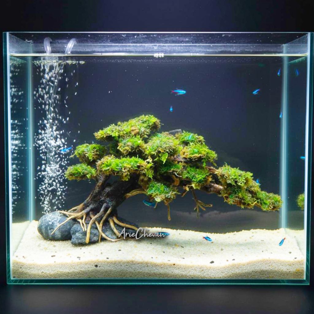 hiasan aquarium pohon bonsai tree on a stone doyong aquascape include moss