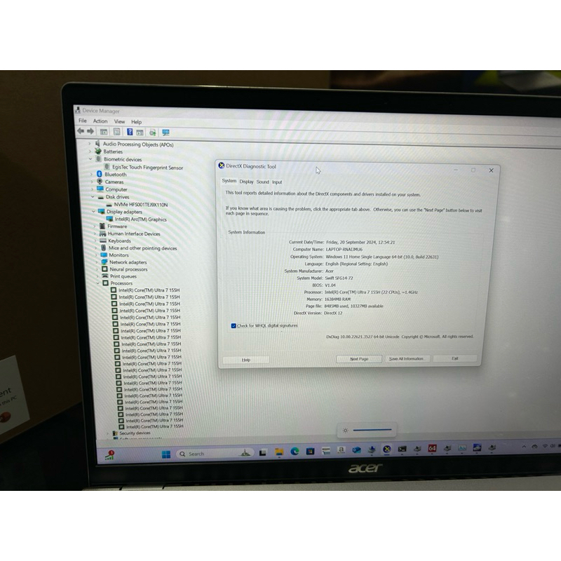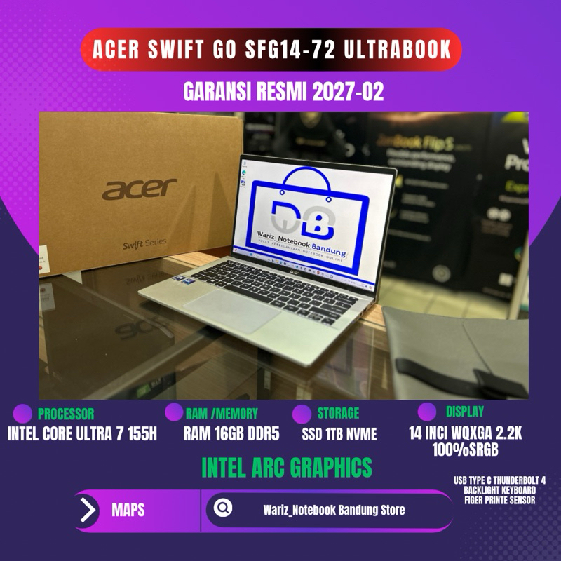 ACER SWIFT GO SFG14-72 INTEL CORE ULTRA 7 155H RAM 16GB SSD 1TB 14inci 2.2K FULLSET GARANSI RESMI