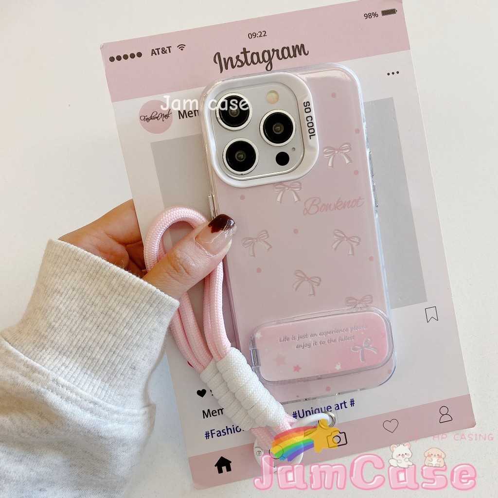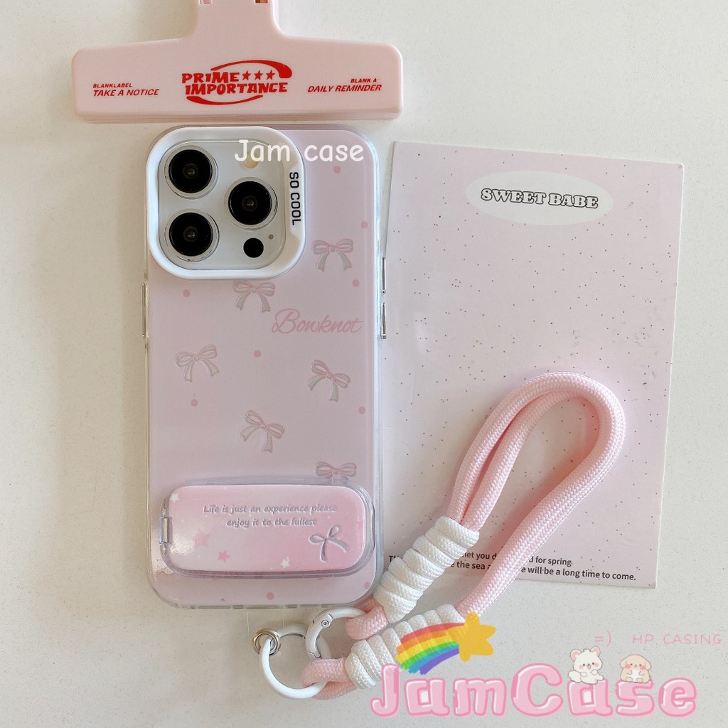 case iPhone 13 Pita merah muda dengan dudukan dan gelang Casing ponsel cocok untuk iPhone 11 11PROMAX Softcase Macaron 12 13 14 15 16 PRO PROMAX Casing ponsel kartun 7PLUS XR XSMAX Kasus ponsel lucu Tahan air