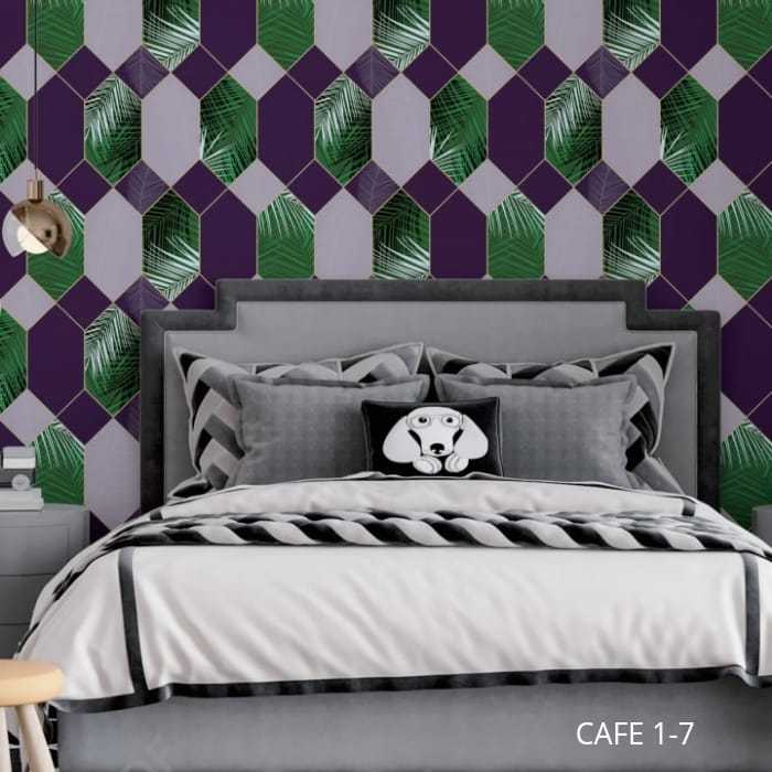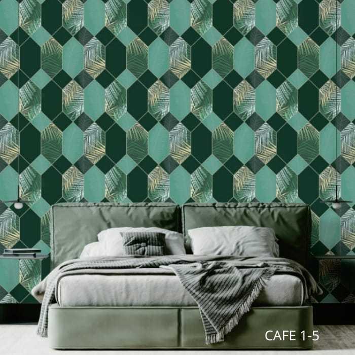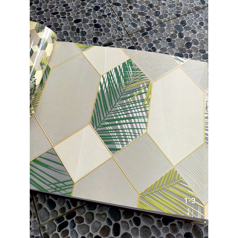 Wallpaper Le Cafe - Wallpaper Dinding Geometris Daun Hijau Kuning Abu Gold