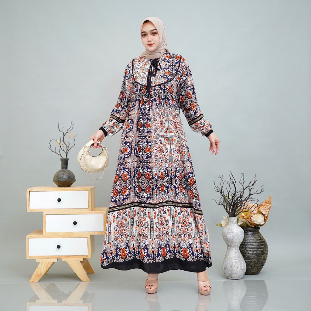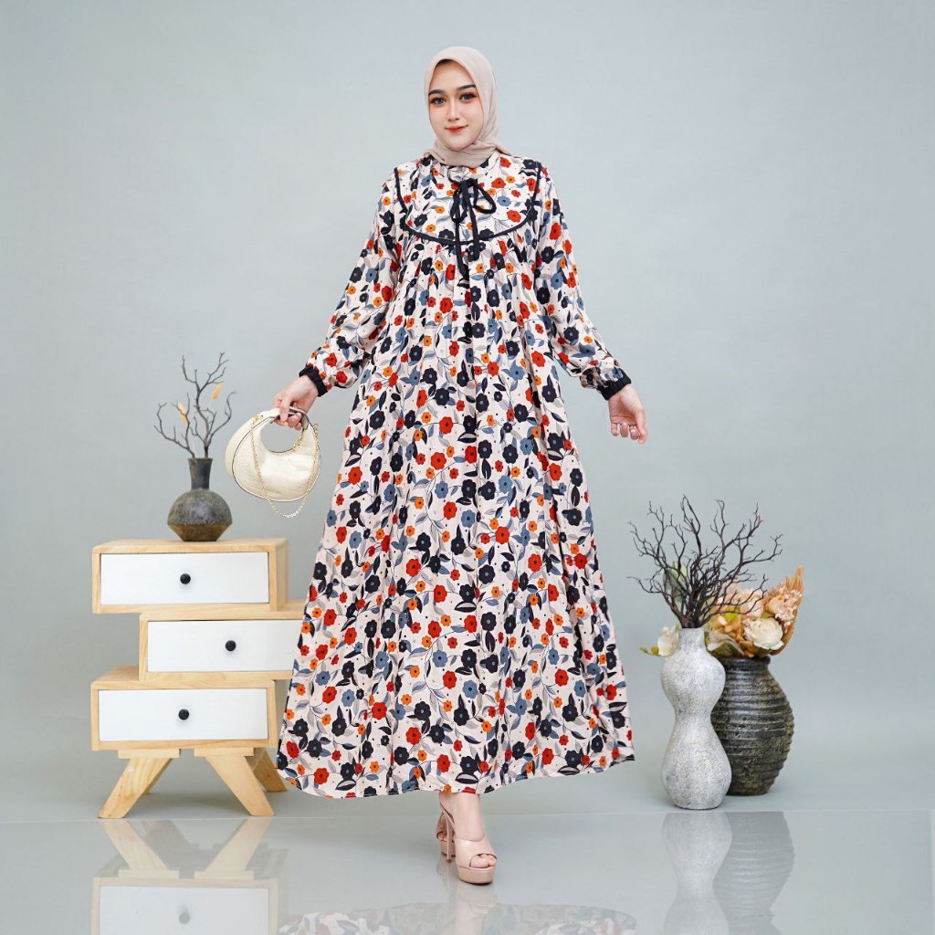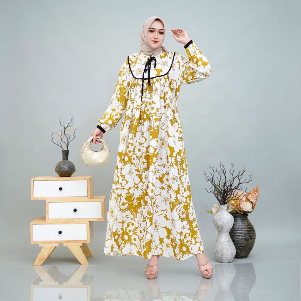 Listya Dress Rayon Diamond Aksen List Gamis Motif Bunga Nyaman Adem Busui Friendly