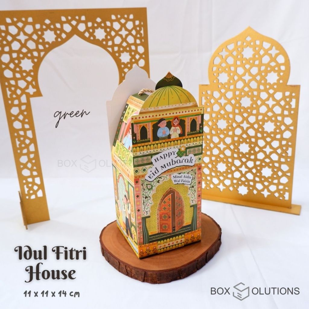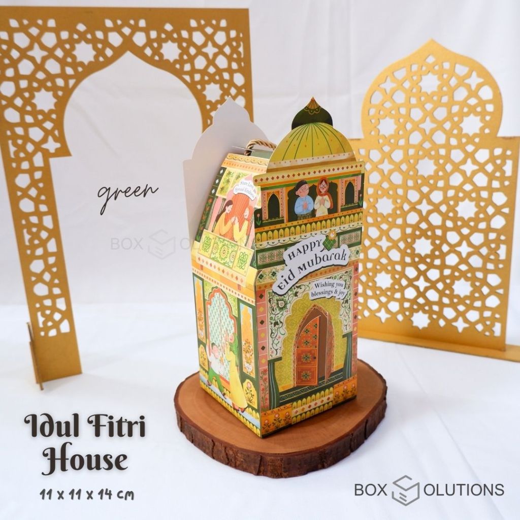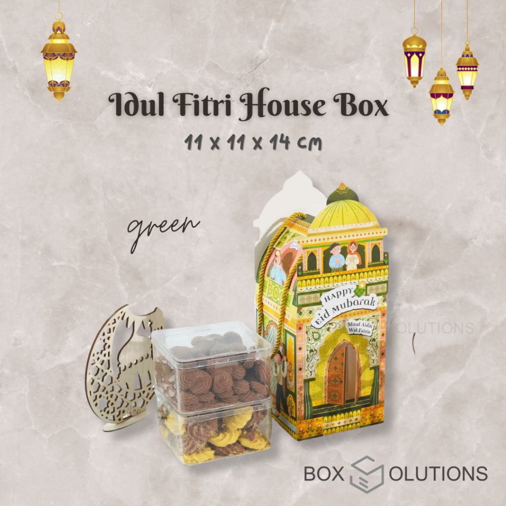 idul fitri house box green / box hampers lebaran hijau / box toples idul fitri jinjing + tali - 11x11x14 cm