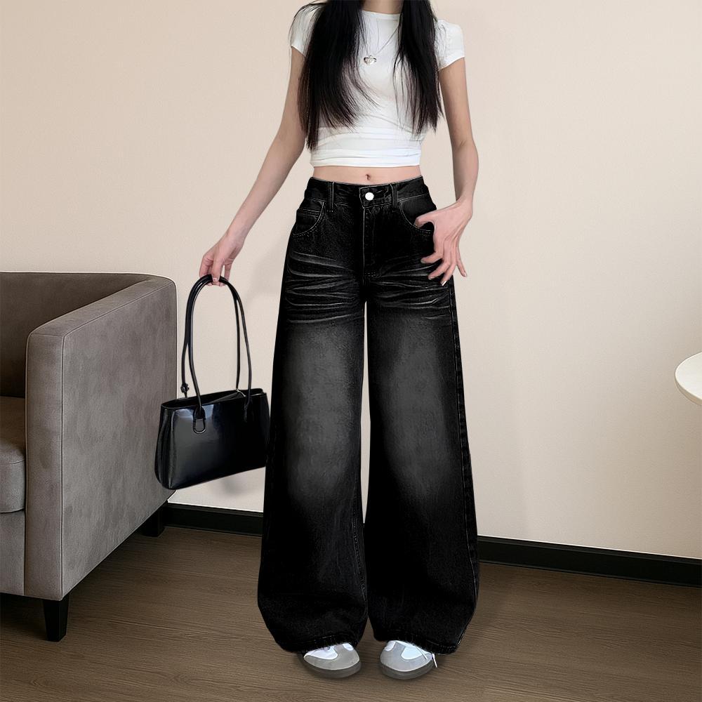 Lucky88k Celana Baggy Jeans Wanita Abu Abu Retro High Waist Korean Style Fashion Pants | Nyaman dengan Bahan Katun Denim