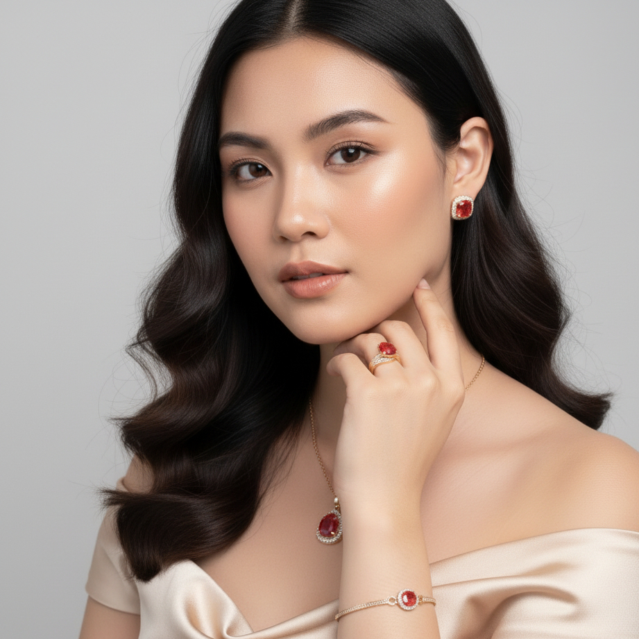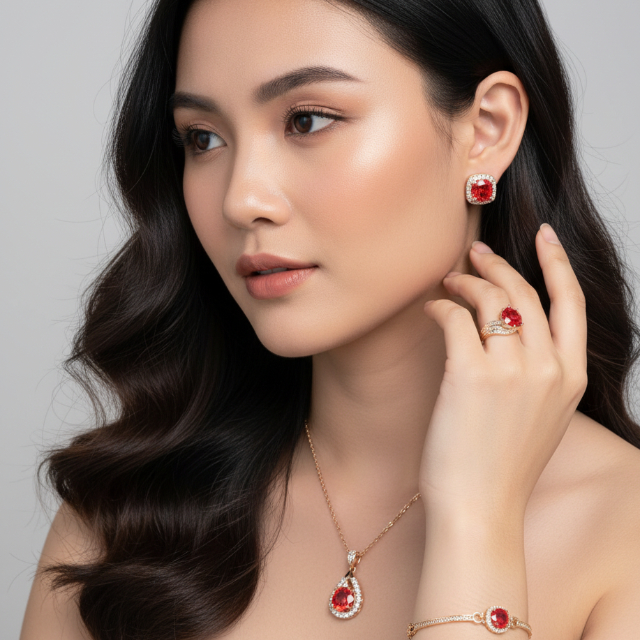 ((FREE BOX)) Ruby Glow Set: Gelang, Kalung, Anting & Cincin Crystal Merah & Zircon AAKBS0003