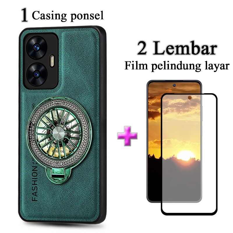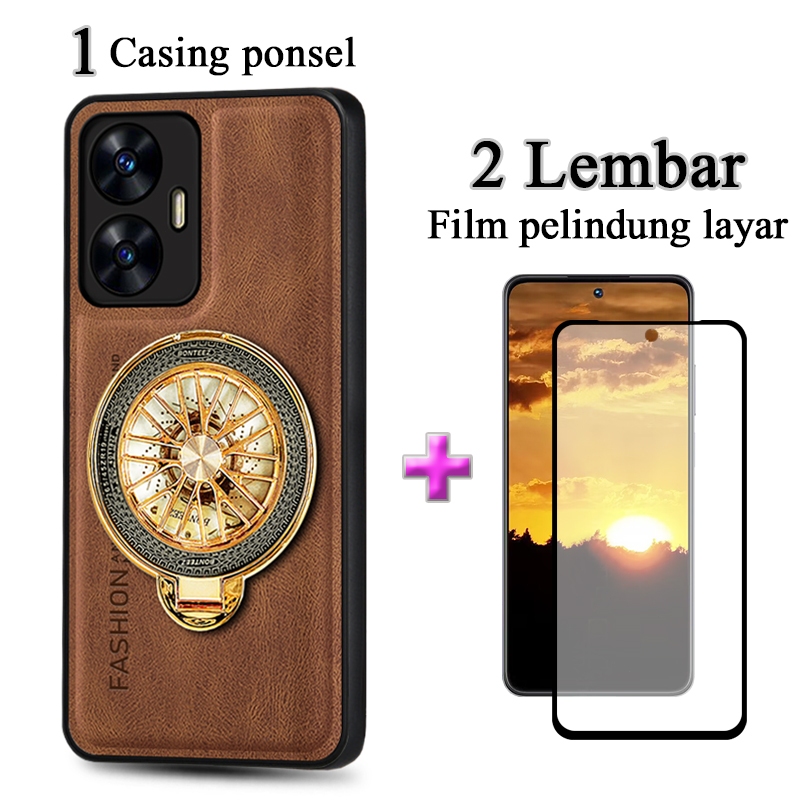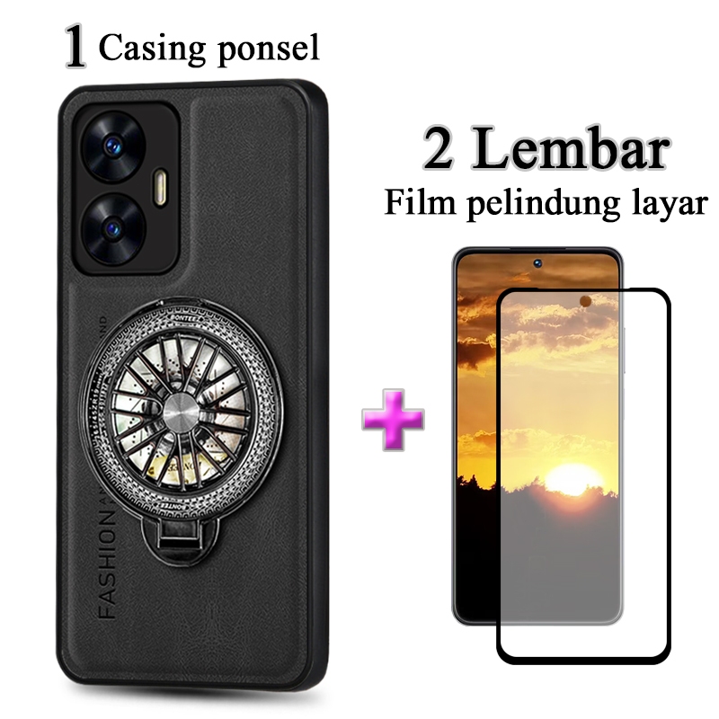 2 In 1 Casing Realme C55 Case Kulit Premium Dengan Stand Holder Film Keramik Layar Protektif