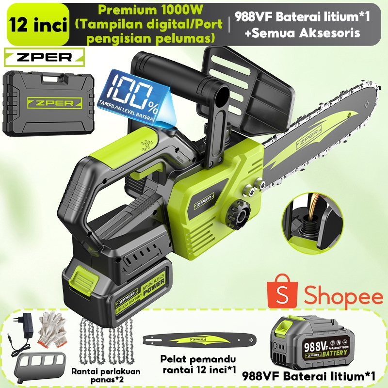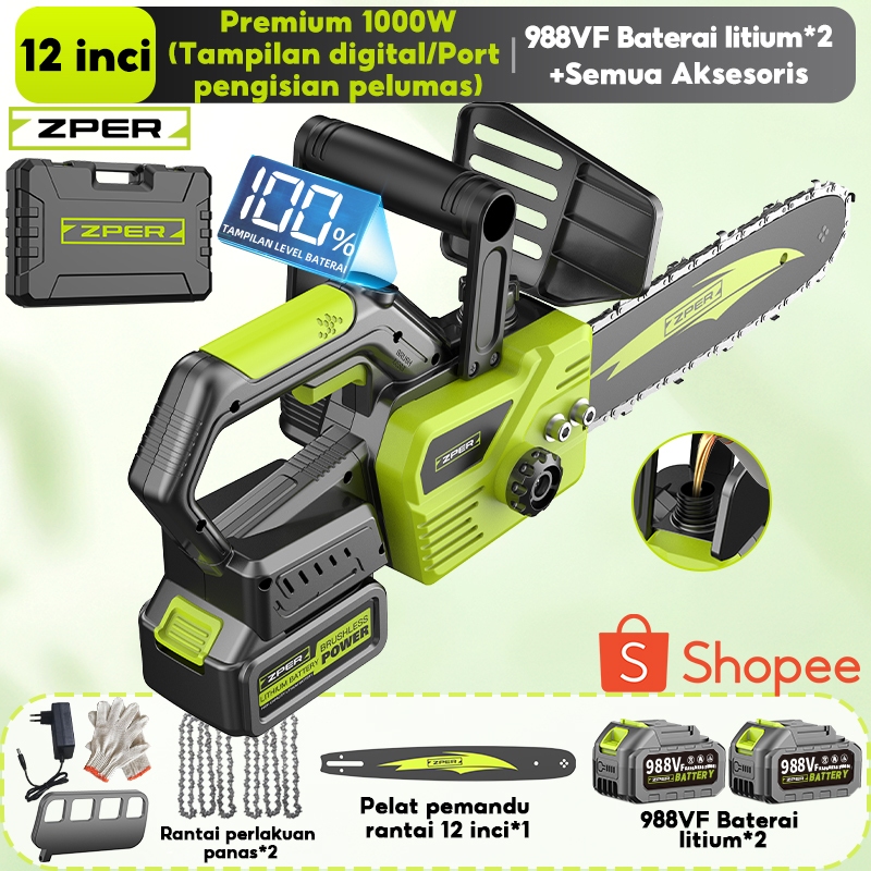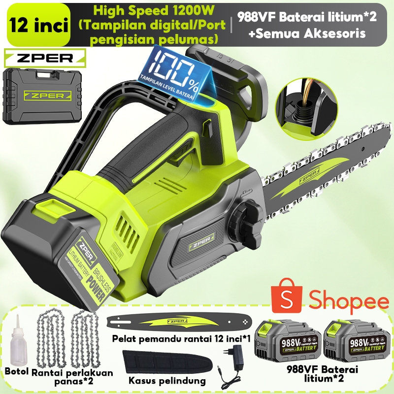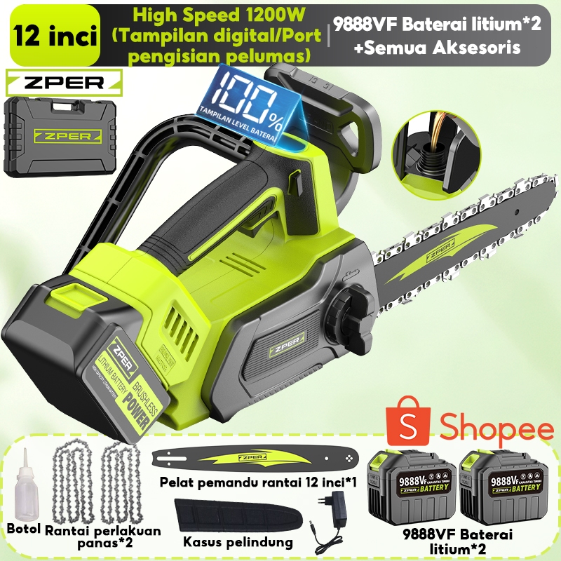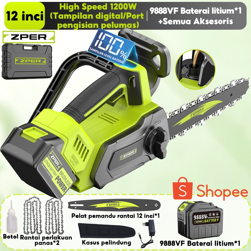 ZPER Mesin Gergaji Kayu 12 Inci Gergaji Kecepatan Tinggi Chainsaw Listrik Gergaji Potong Kayu Rantai Elektrik Lithium High Speed Saw