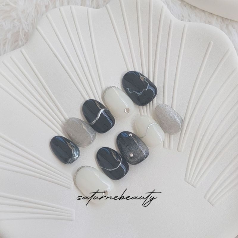 207 premium press on nails by saturne beauty| black white chrome cat eye nails| fake nail art| free lem dan kikir