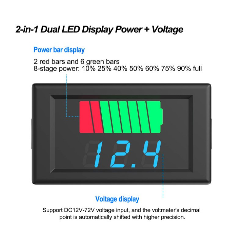 Battery Monitor (Waterproof) 2 in 1 Voltage Meter 12V, 24V, 36V, 48V, 60V, 72V LED Digital Battery Capacity Tester