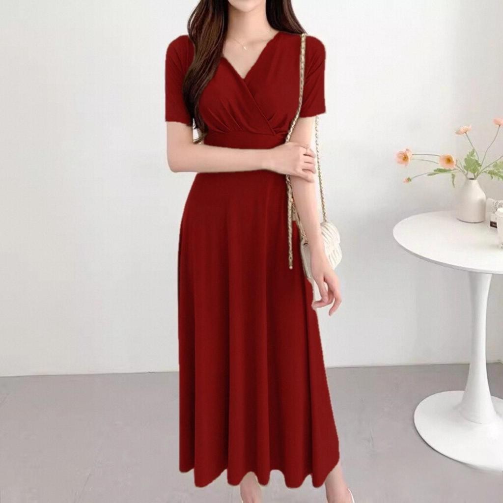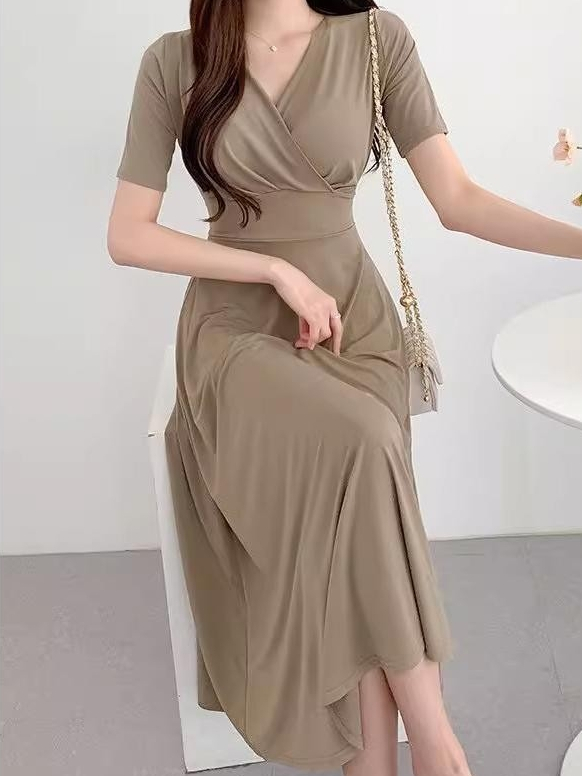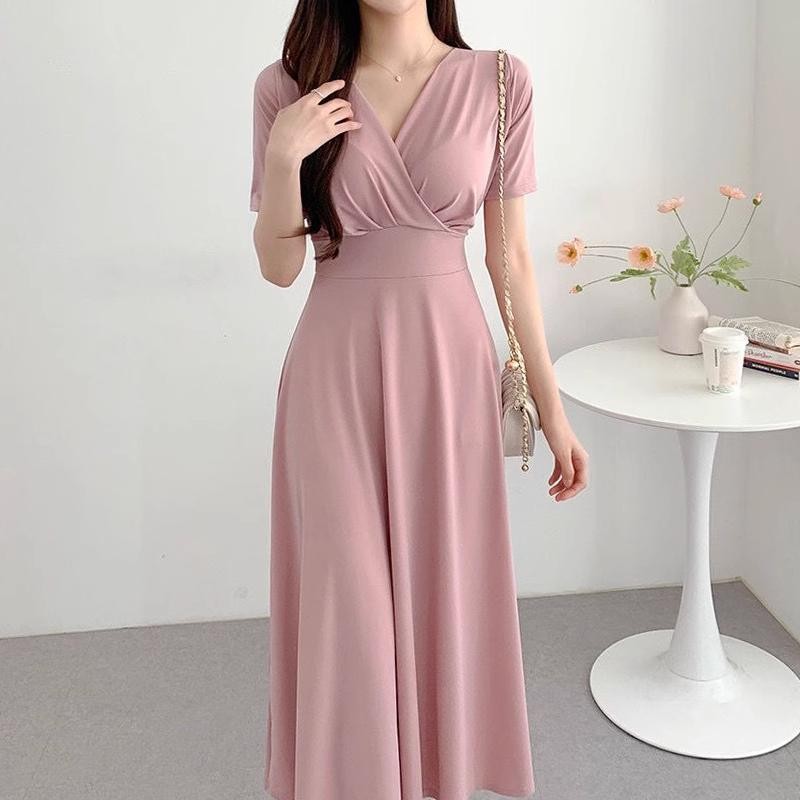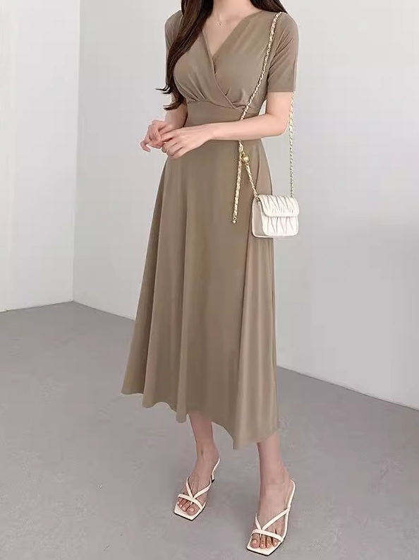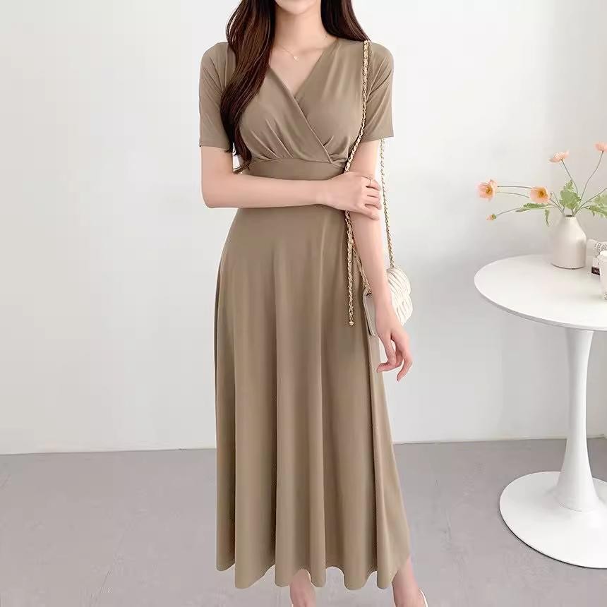 Hertha Duga long beige dress coklat korean style elegant casual midi dress vintage terbaru 2026 kondangan wanita kekinian