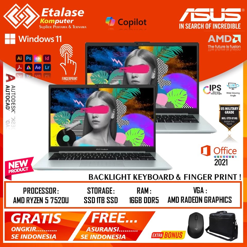 Resmi Asus Vivobook Go 14 E1404FA Amd Ryzen 5 7520U 16GB DDR5 512GB 1TB SSD 14.0 Fhd Windows 11 ori