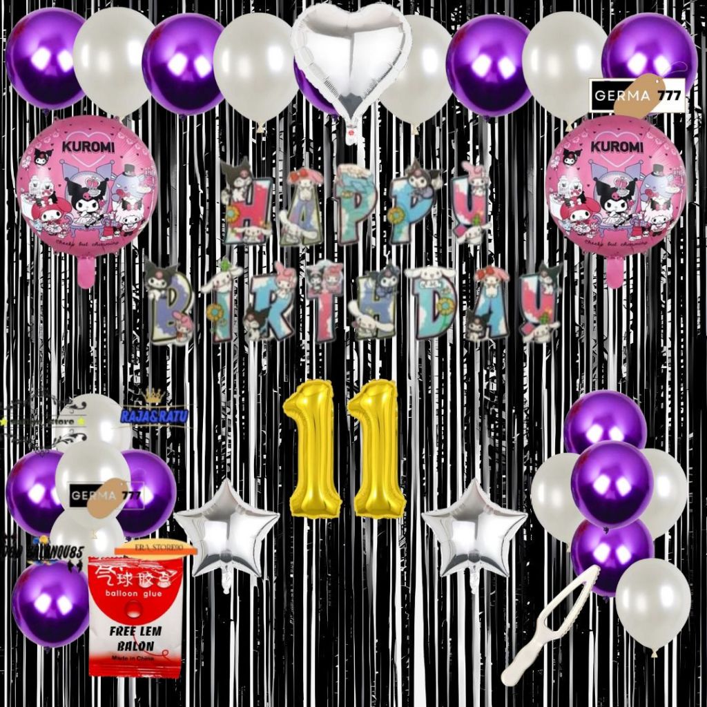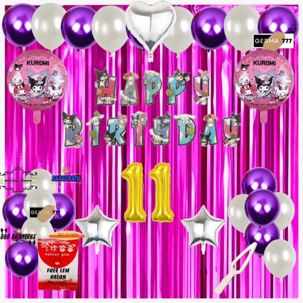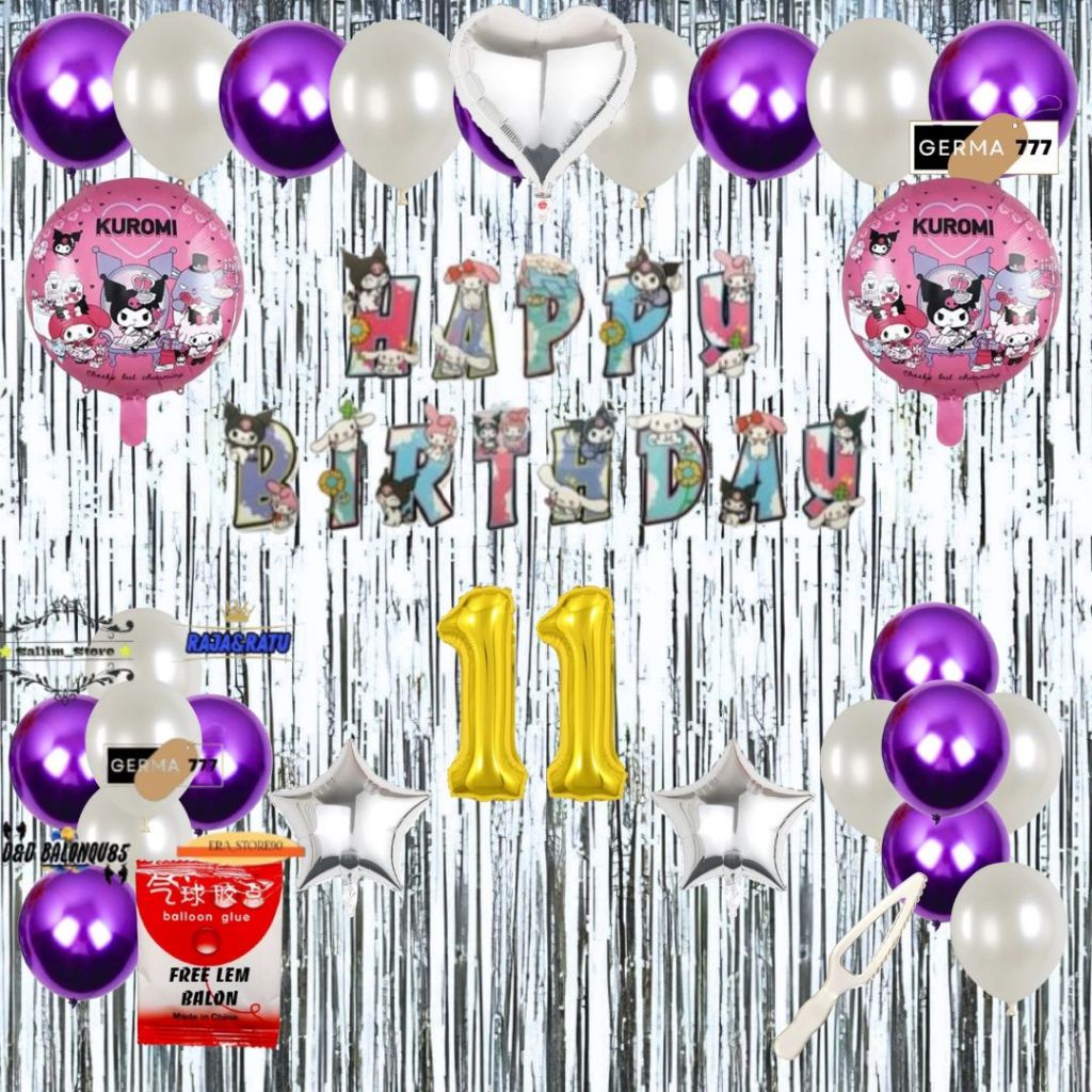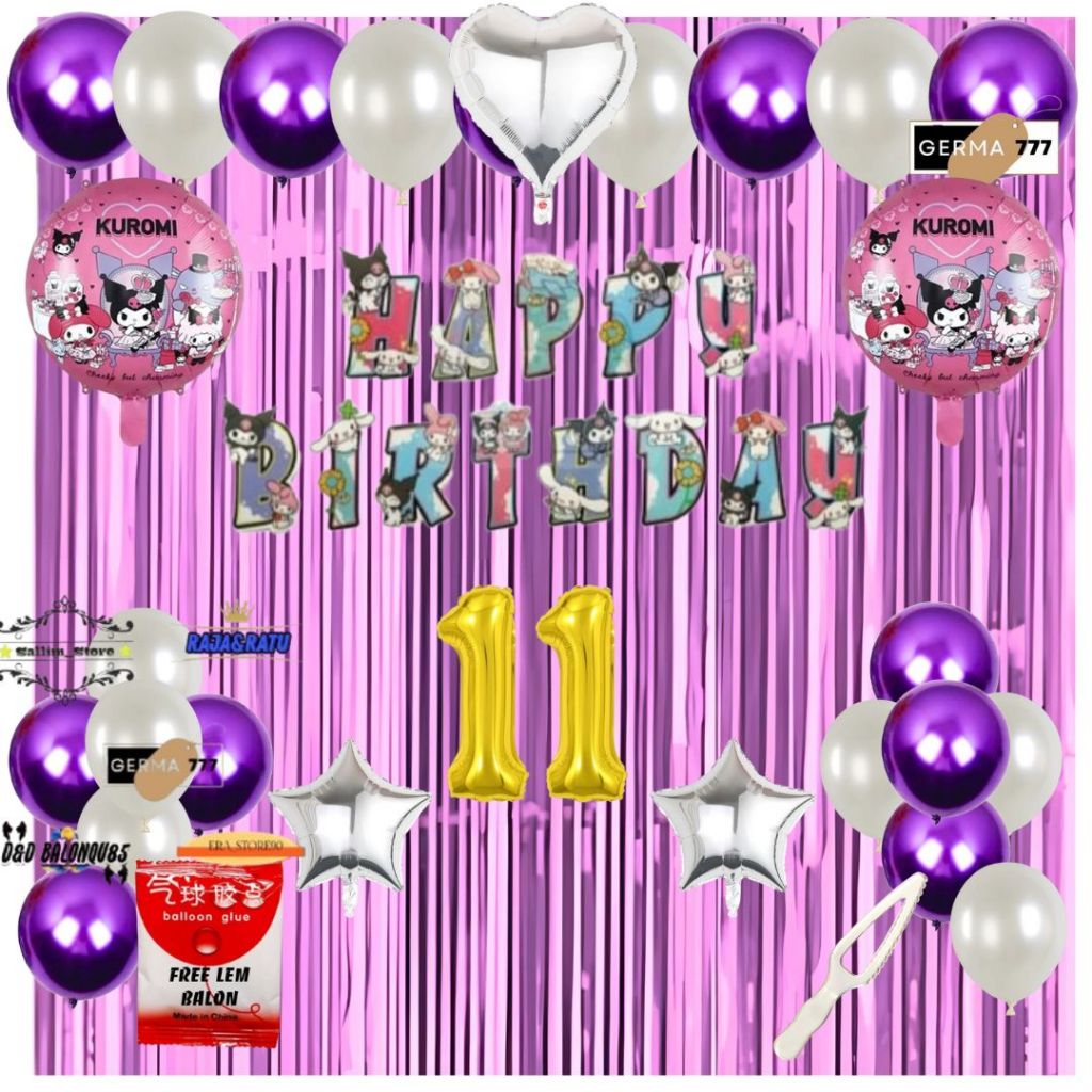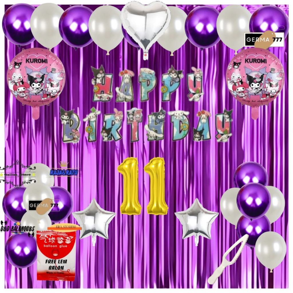 Paket Set Dekorasi Pesta Ulang Tahun Anak Banner Happy Birthday Kuromi Balon Ungu Putih Simple