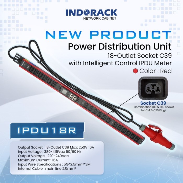Indorack IPDU18 Smart PDU 18 Outlet C39 (C13 & C19 Socket) With Headplug 3pin 2p+E 16A - Merah - Stop Kontak 16 Lobang - Stop Kontak Bagus - Stop Kontak Industri - Stop Kontak - Merah