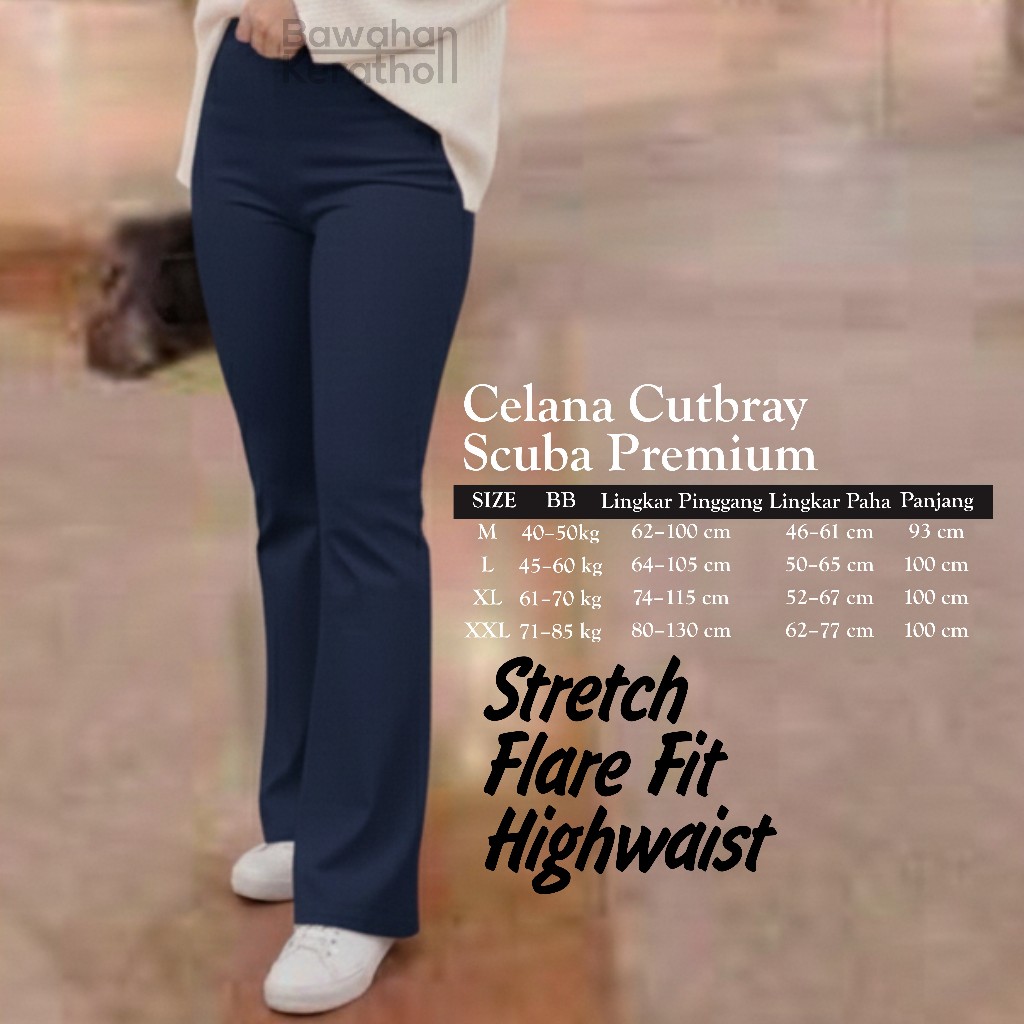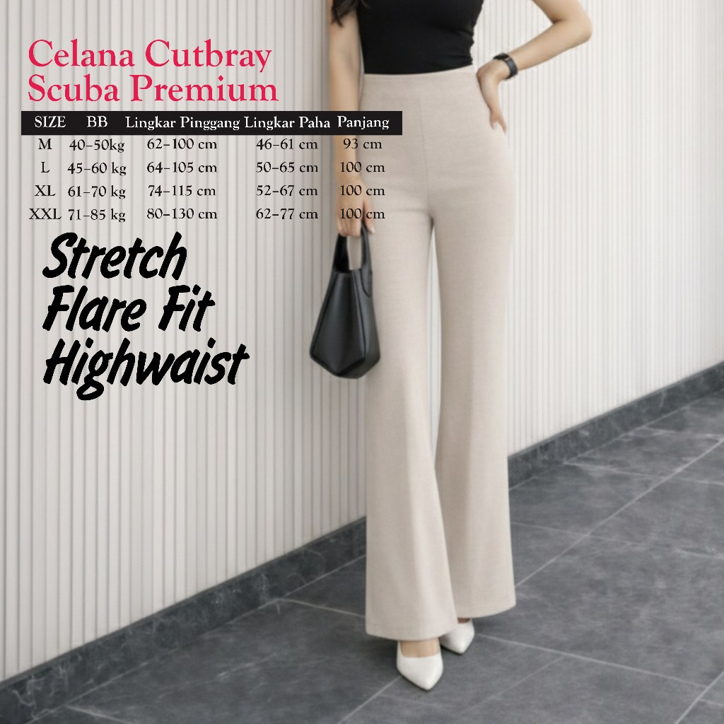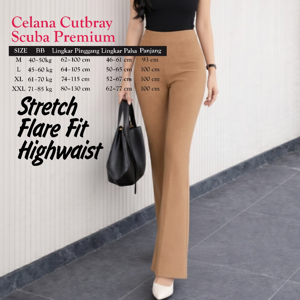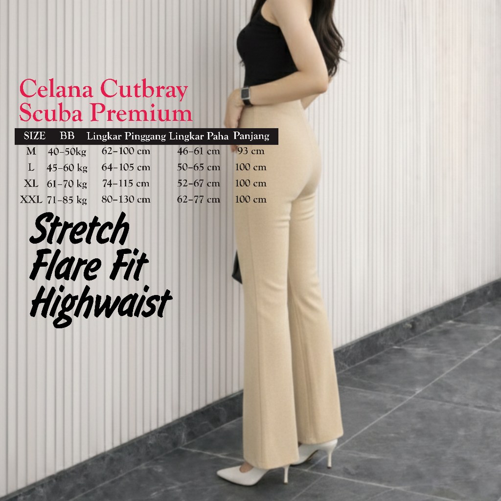 Flare Pants Highwaist Celana Scuba Cutbray Tebal - Celana Kerja Wanita Kantor Bahan Adem Anti Kusut
