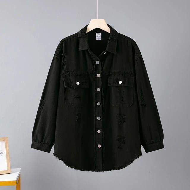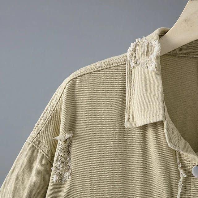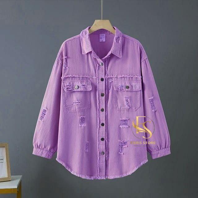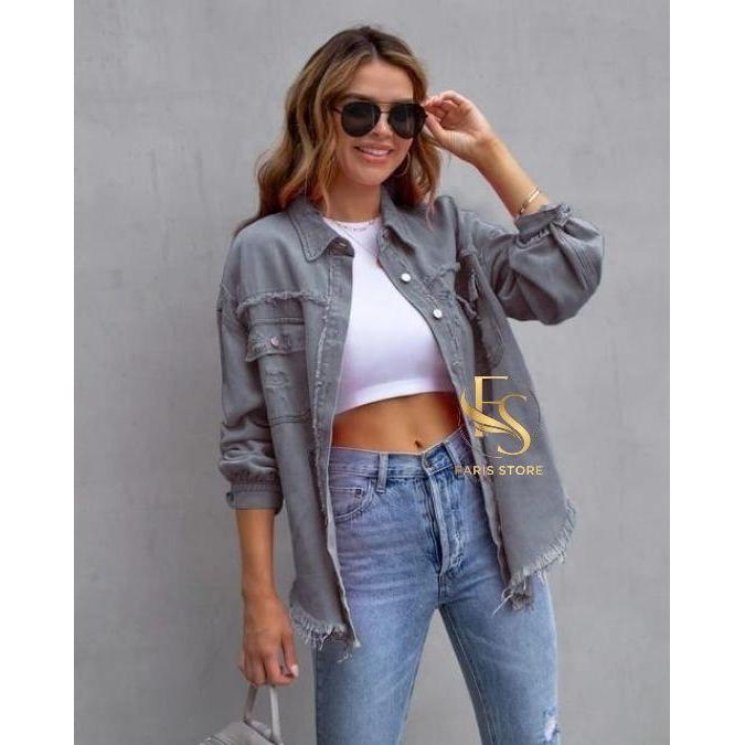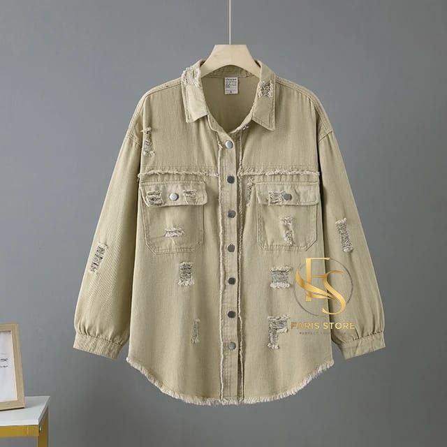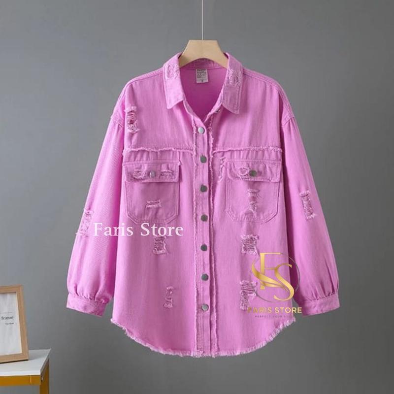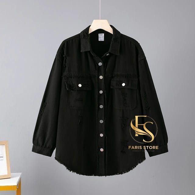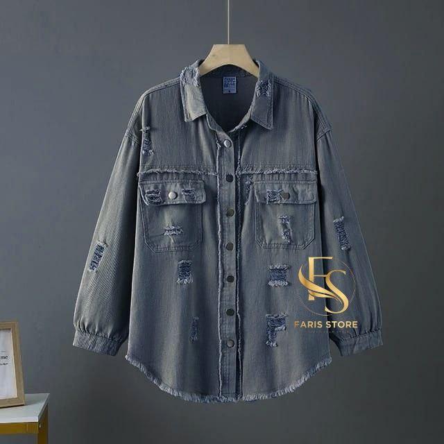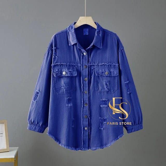 Faris Jaket Denim Kemeja Jeans Oversize Sobek Lengan Balon Wanita Terbaru Kekinian