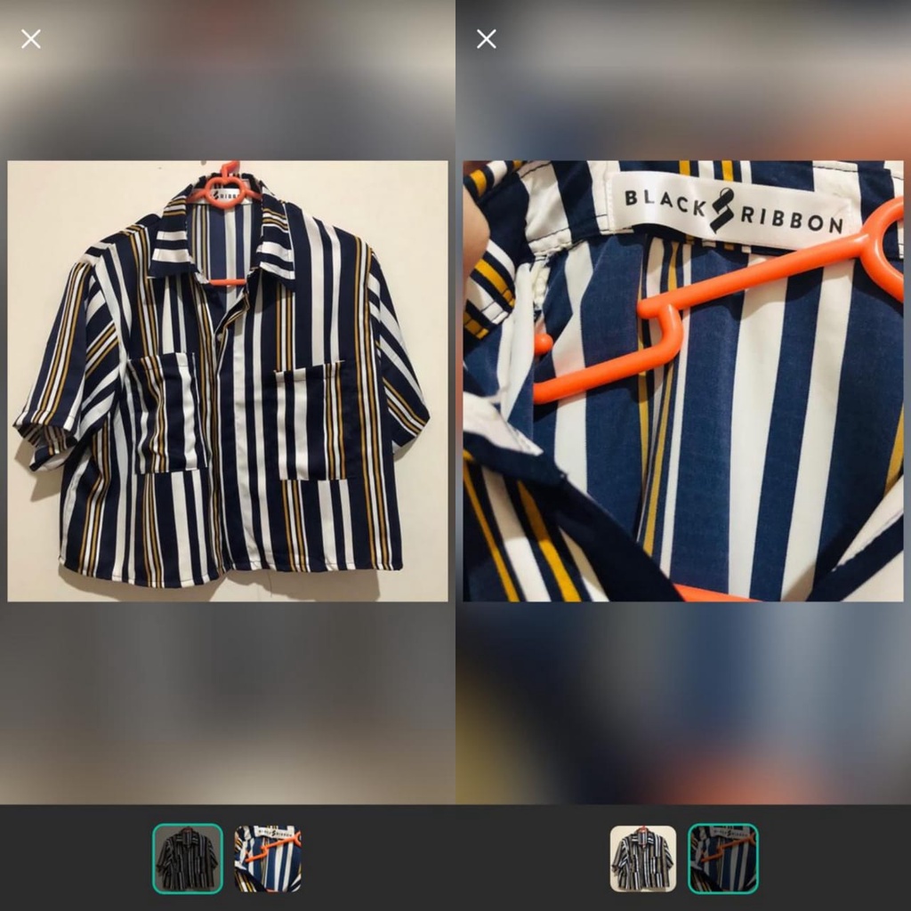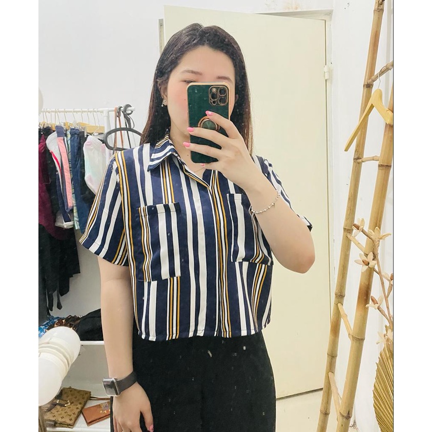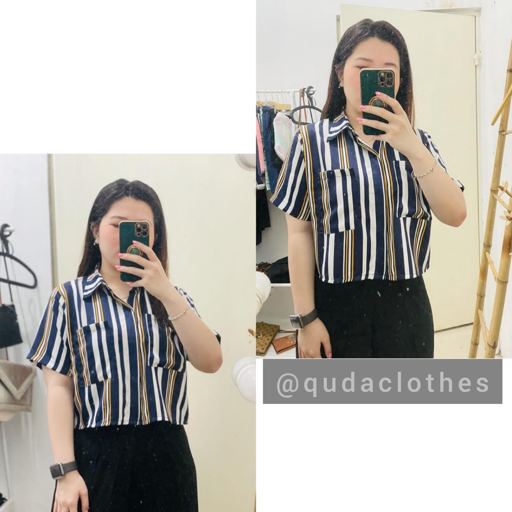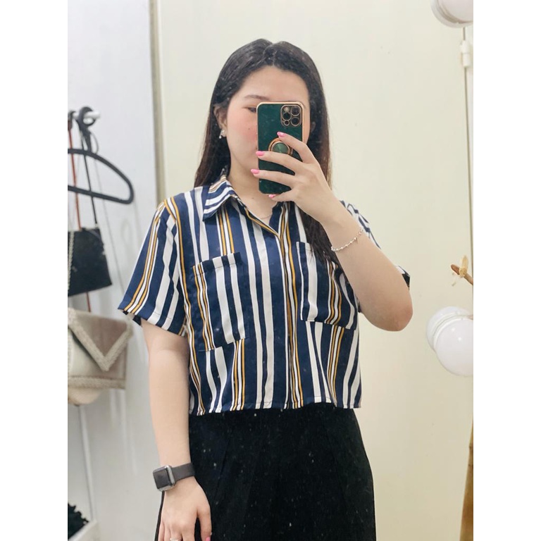 kemeja salur crop top brand new ribbon