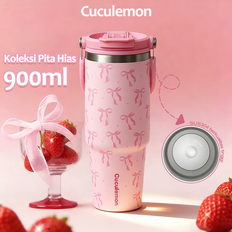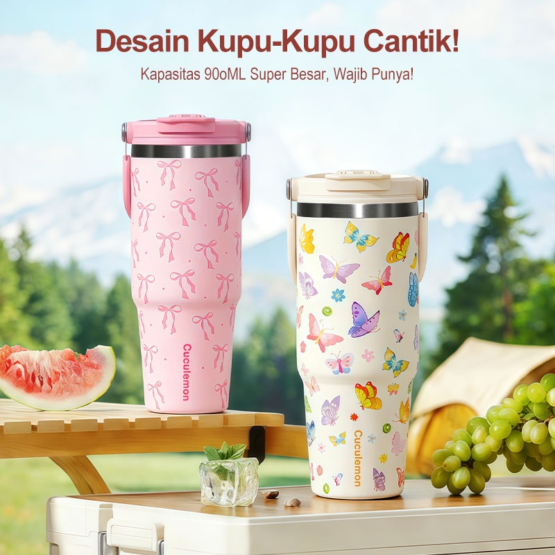 Cuculemon Tumbler 900ML Motif Aesthetic Kupu Kupu Pita Tahan Panas Dingin Stainless Steel 304 Vakum Insulated Dua Mode Minum Botol Minum Portable Car Thermos