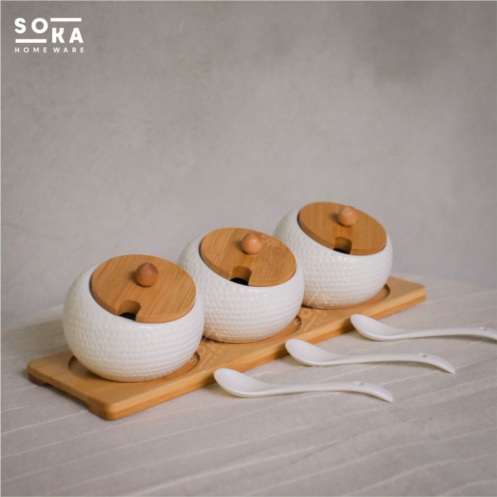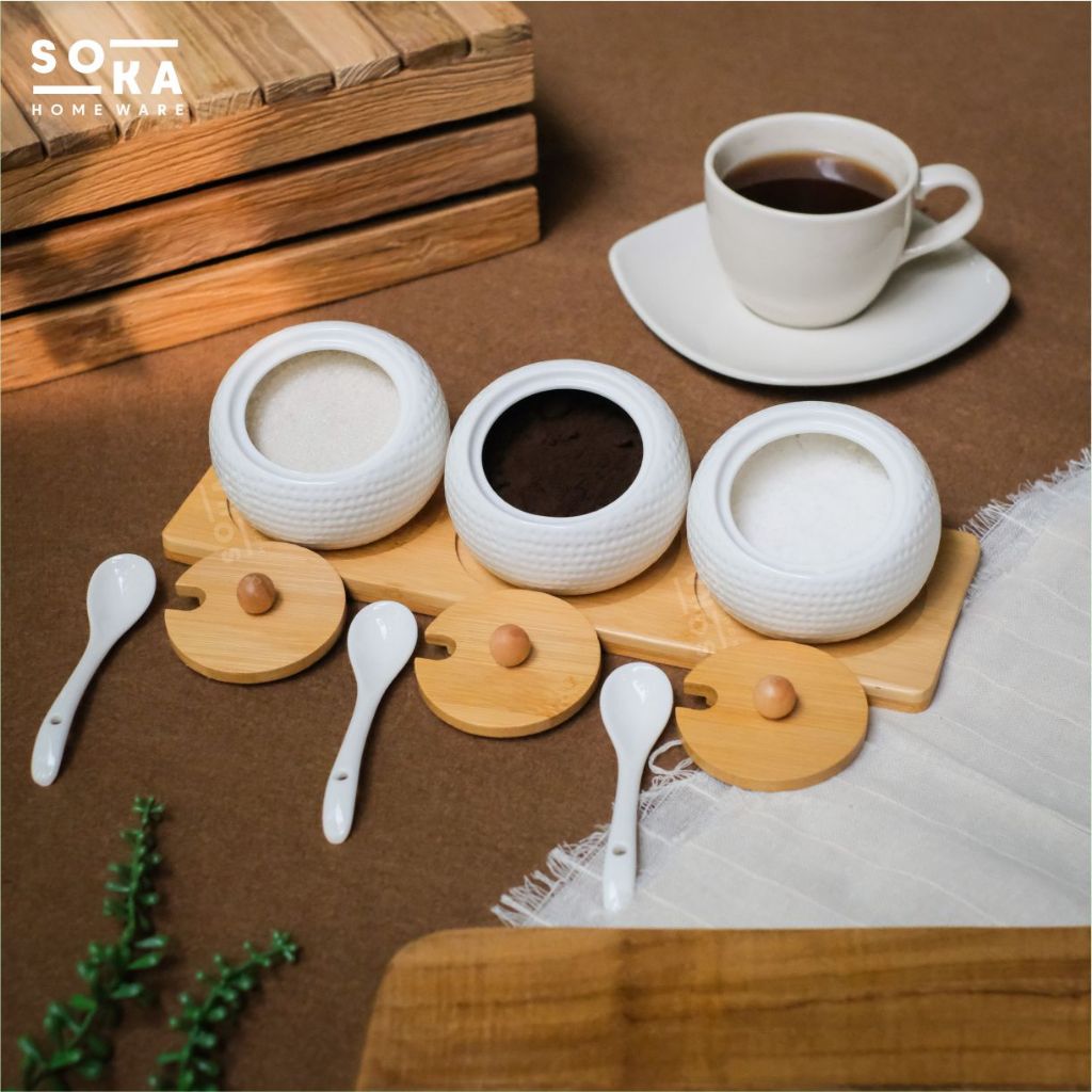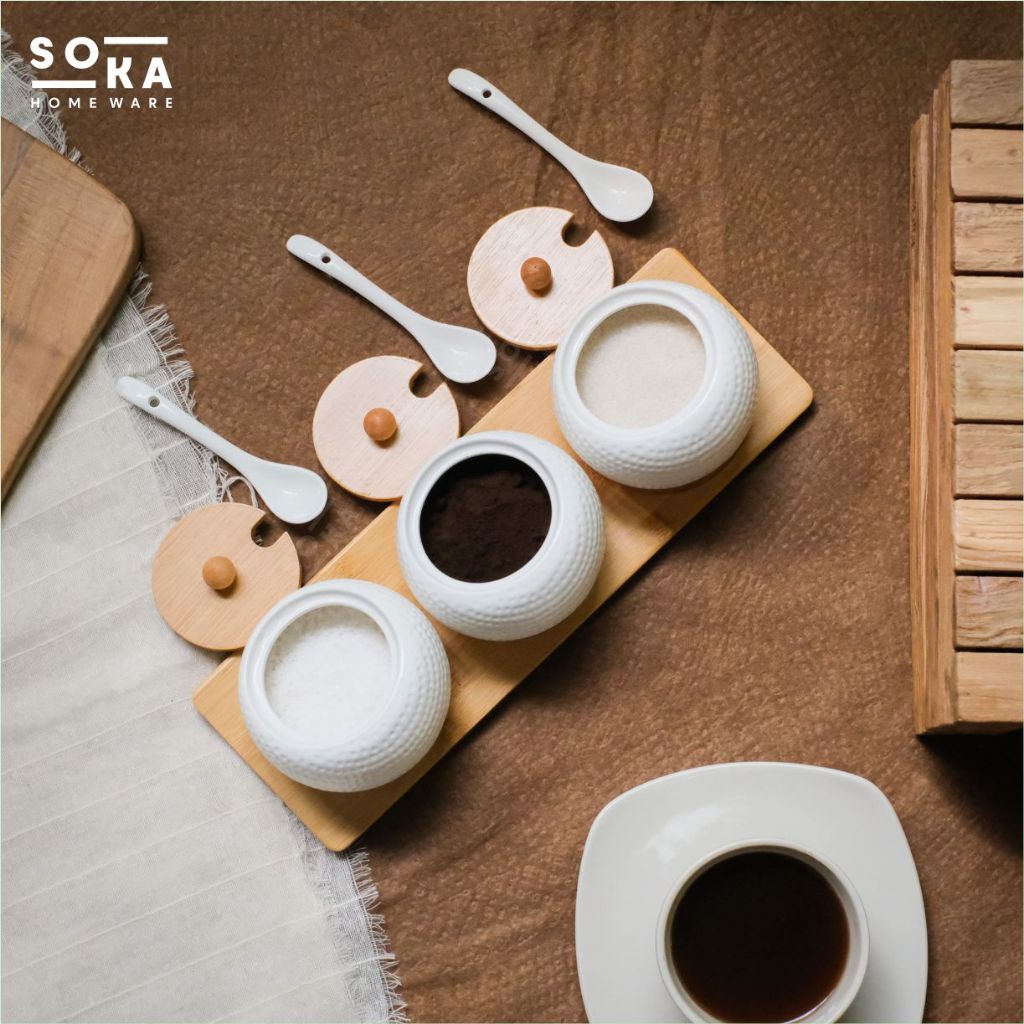 Jar/Toples Keramik Set Sendok 3IN1 – Jar Gula / Garam / Kopi dengan Tutup Kayu - SOKA