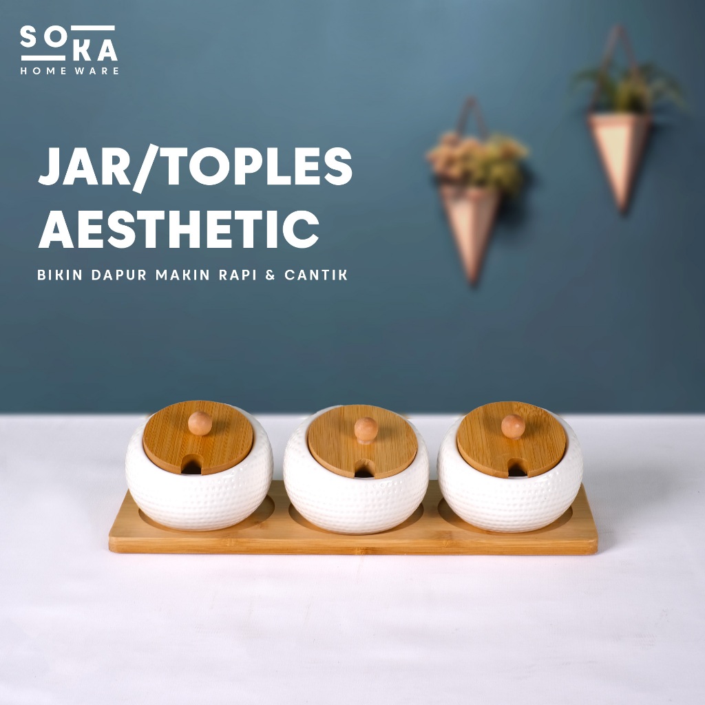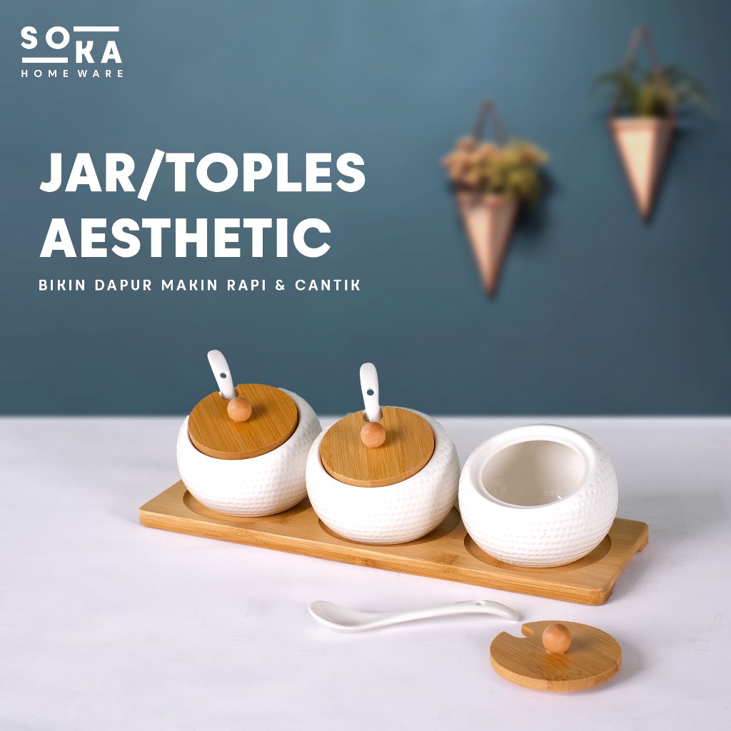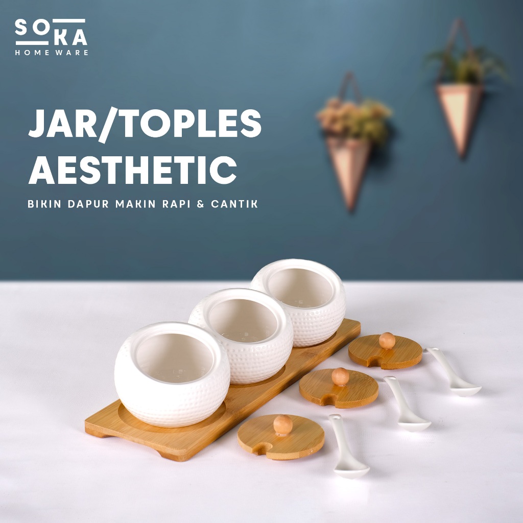 Jar/Toples Keramik Set Sendok 3IN1 – Jar Gula / Garam / Kopi dengan Tutup Kayu - SOKA