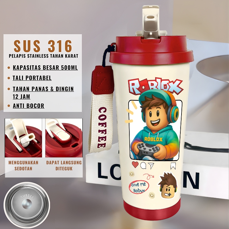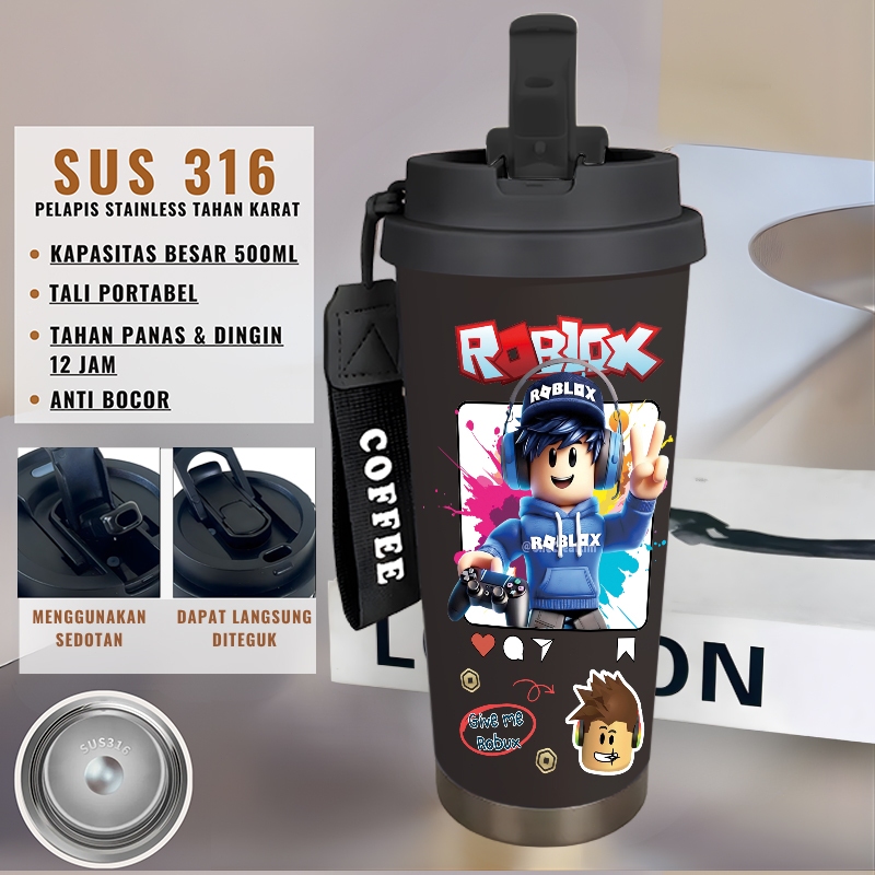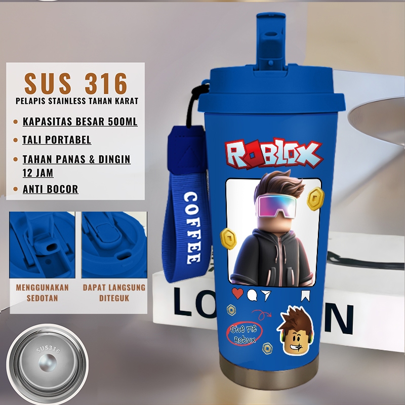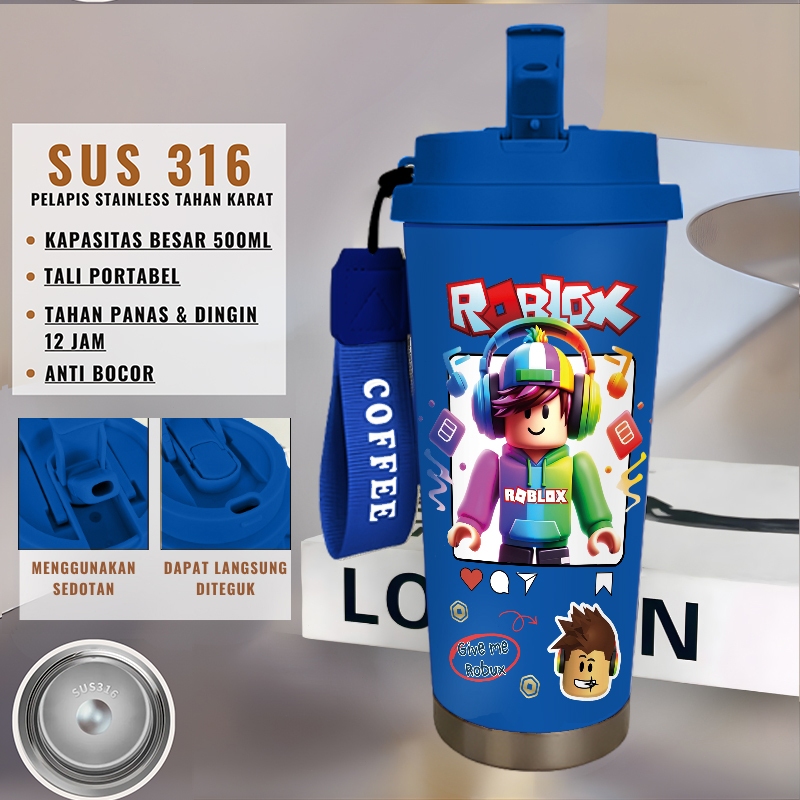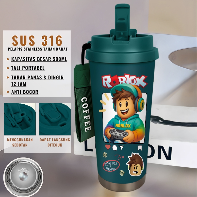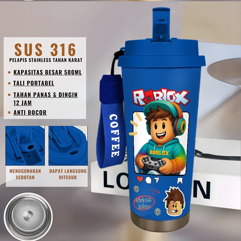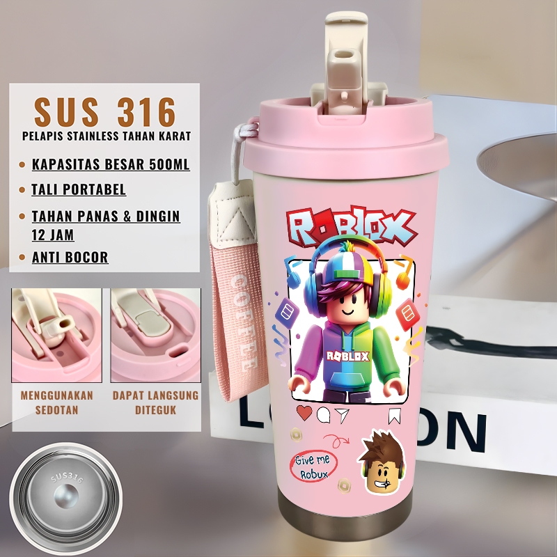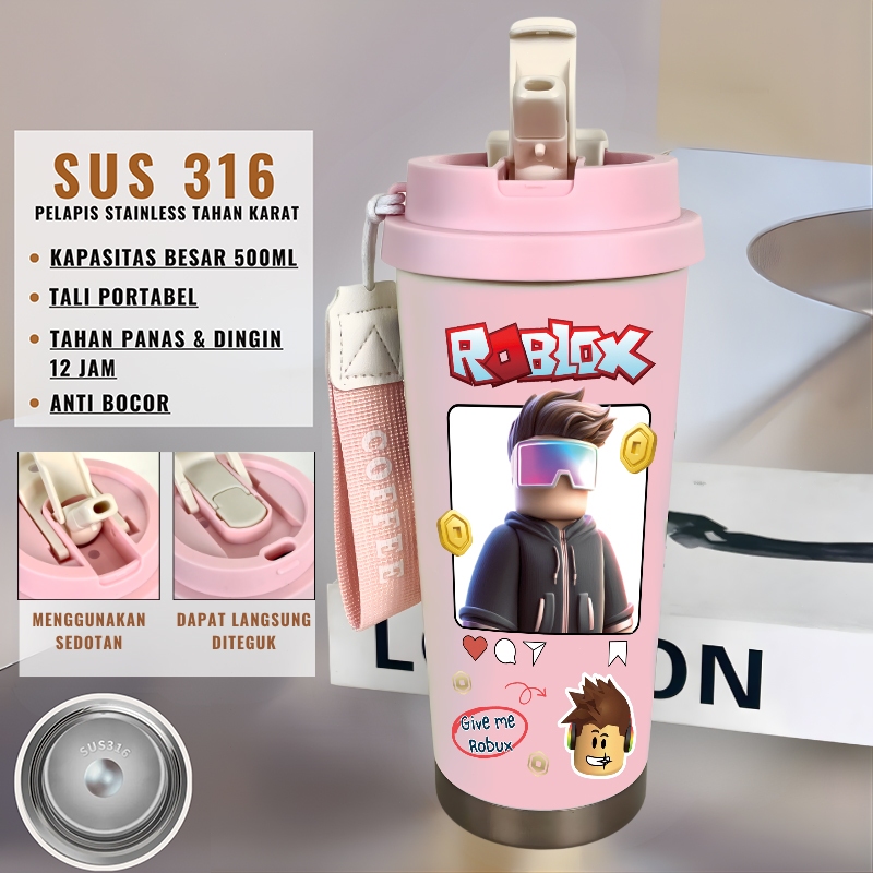 Tumbler Roblox Game Seru 500ml Stainless Steel SUS 316 Botol Minum Anak Gamer Karakter Roblox Anti Bocor Tahan Panas & Dingin 12 Jam dengan Sedotan Portable