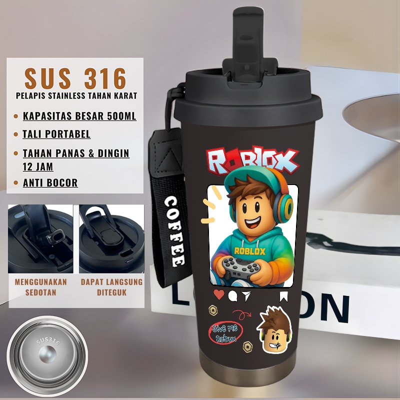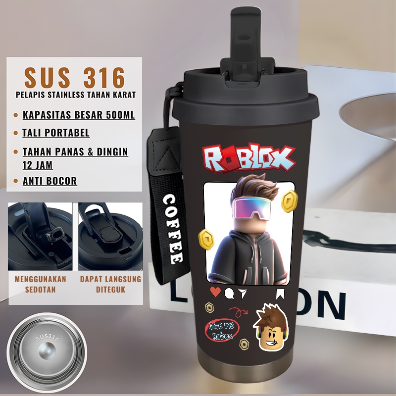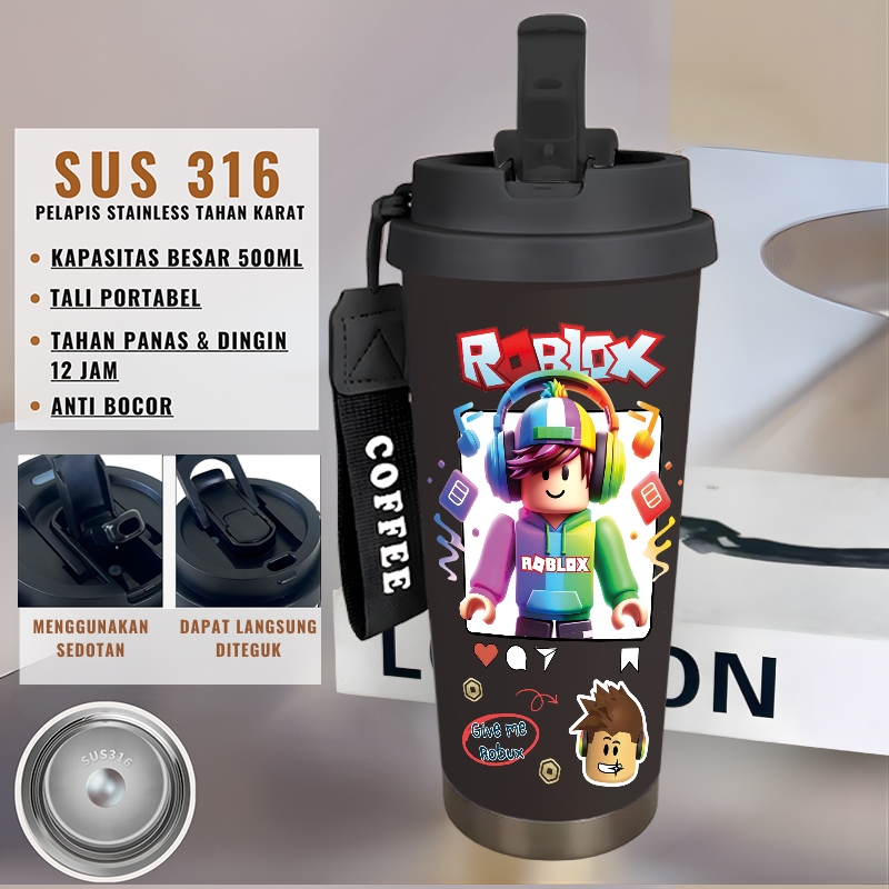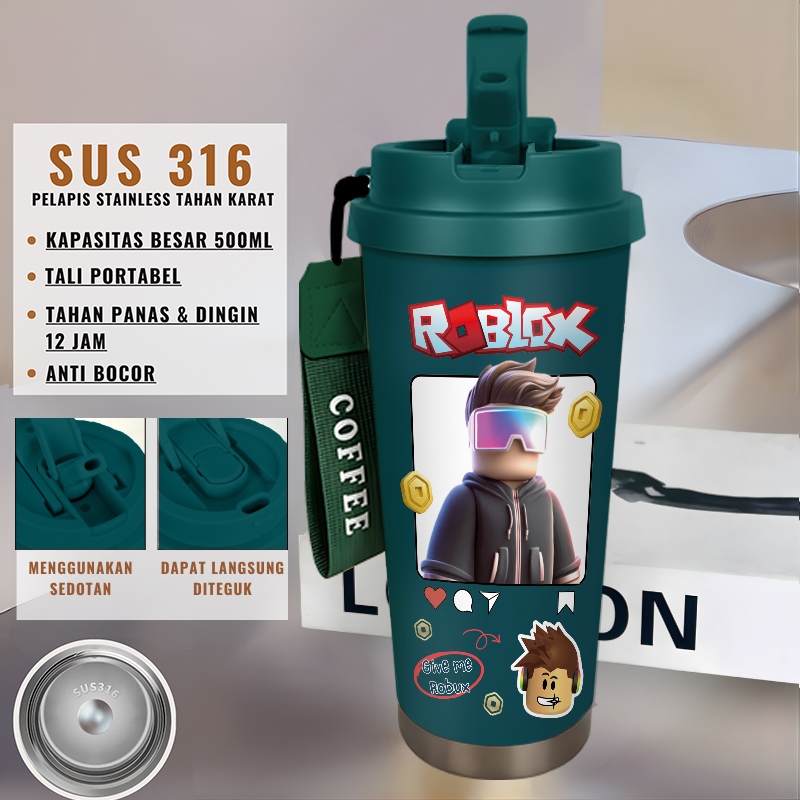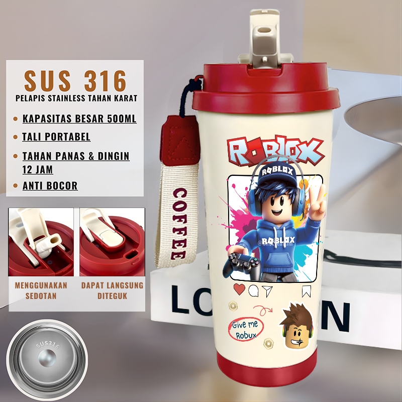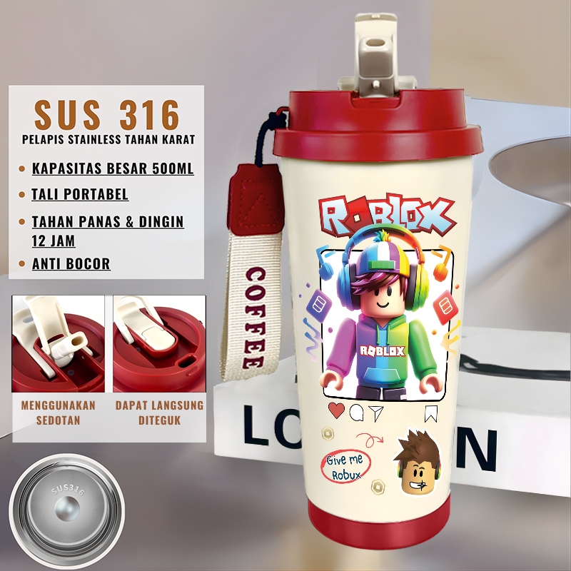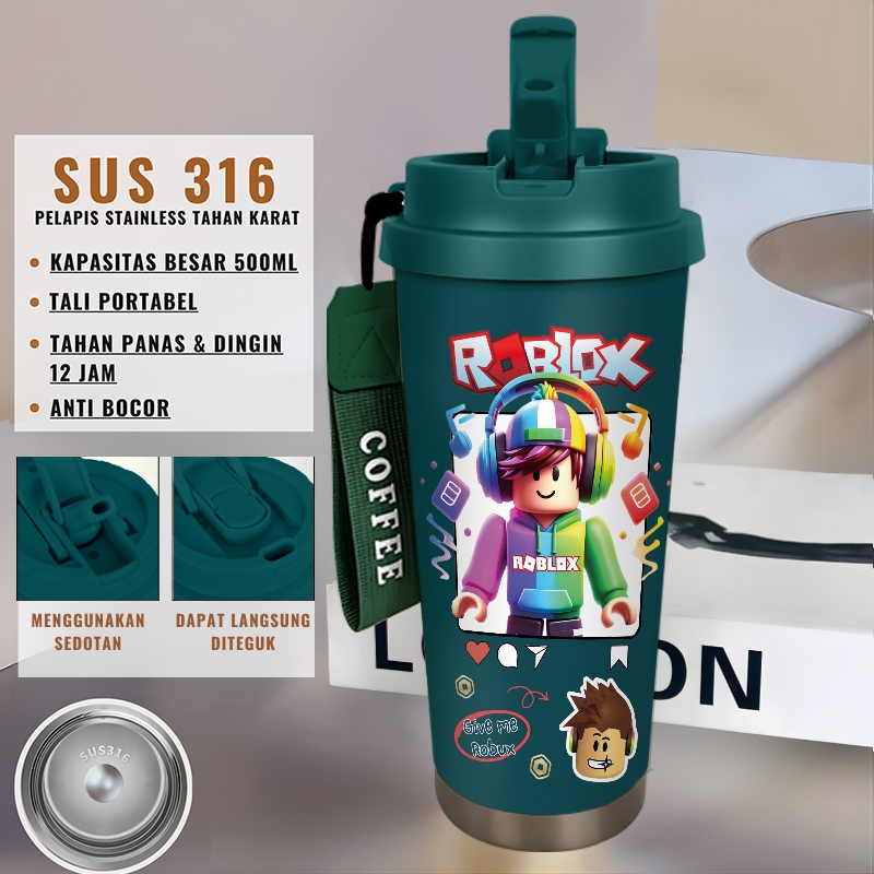Tumbler Roblox Game Seru 500ml Stainless Steel SUS 316 Botol Minum Anak Gamer Karakter Roblox Anti Bocor Tahan Panas & Dingin 12 Jam dengan Sedotan Portable