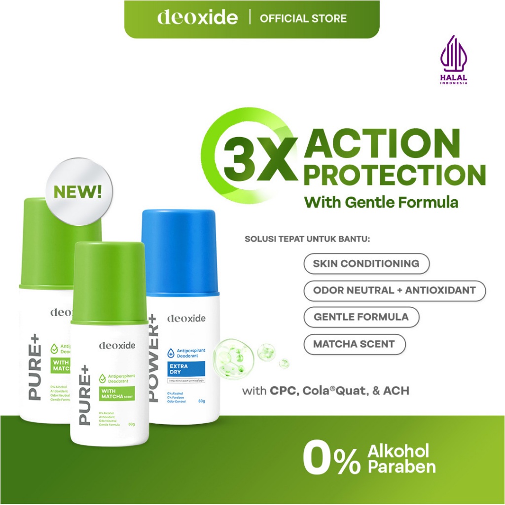 DEOXIDE Pure+ With Matcha Scent Antiperspirant Deodorant Roll On 60 gr 2 Pcs & DEOXIDE Antiperspirant Deodorant Roll On POWER+ For Hyperhidrosis