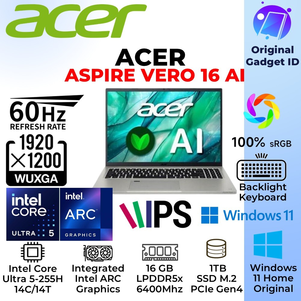 Acer Aspire Vero 16 AI | Intel Ultra 5 225H | Ram 16GB | 1TB SSD | 16" WUXGA 100sRGB | Windows 11+OHS ( Garansi Resmi )