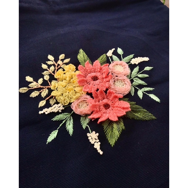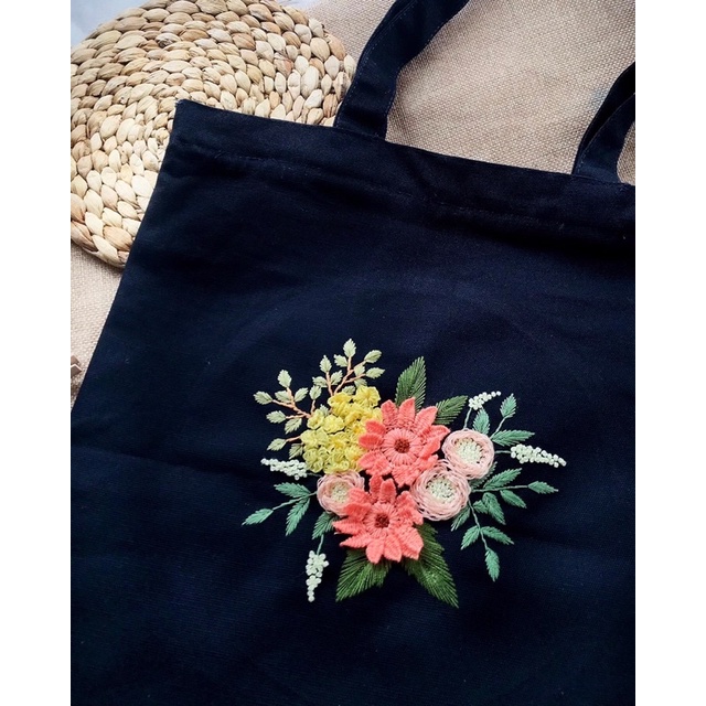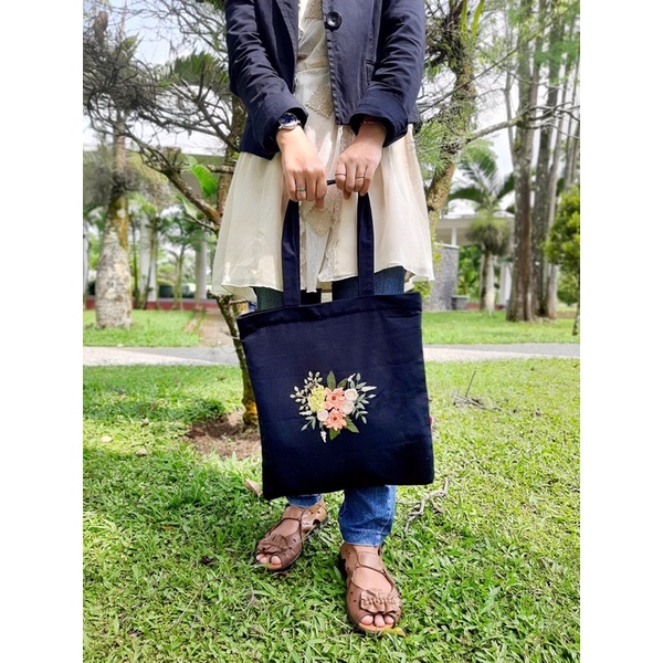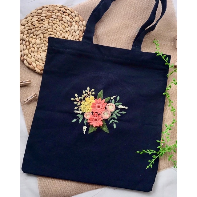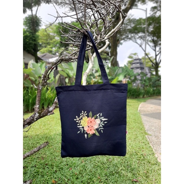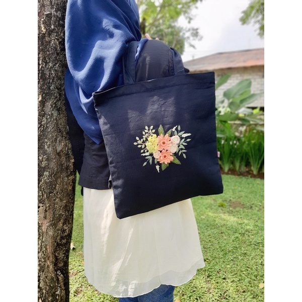 Tote bag kanvas tas kanvas biru donker sulam tangan handmade