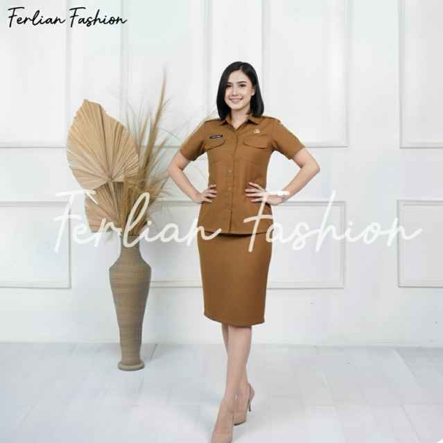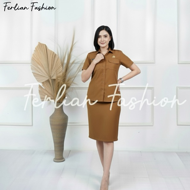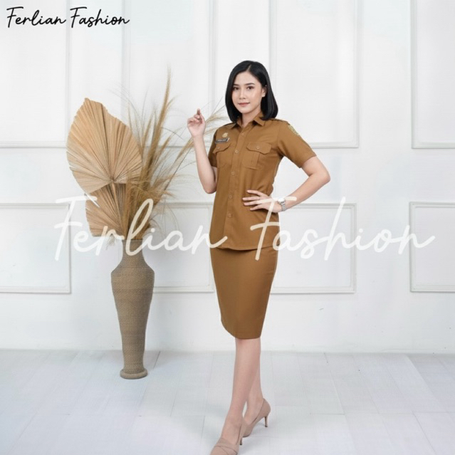 Ferlian - Setelan PDH Model Saku Dada Lengan Pendek Dan Rok Pendek Wanita Kheki Tua Terbaru