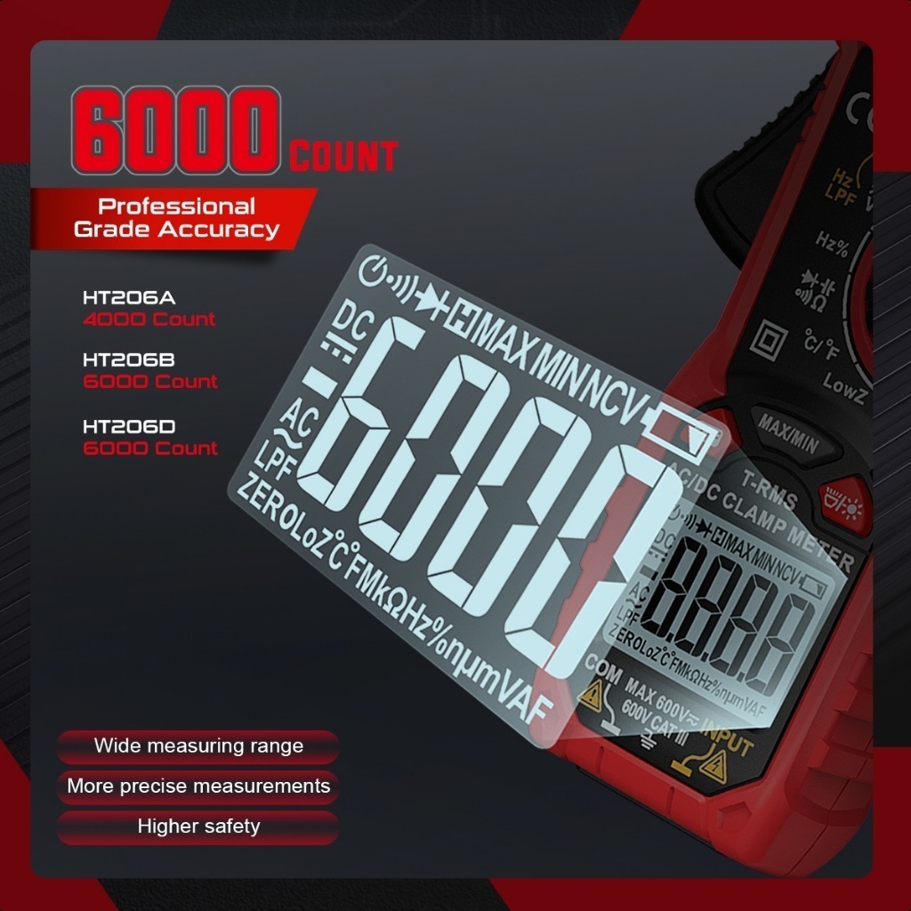 HABOTEST HT206 Meteran Klem 600V AC/DC 6000 Multimeter Digital Penghitung Multimeter Rentang Arus Otomatis 600A Meteran Uji Ampere Tegangan Ohm Kontinuitas Hz