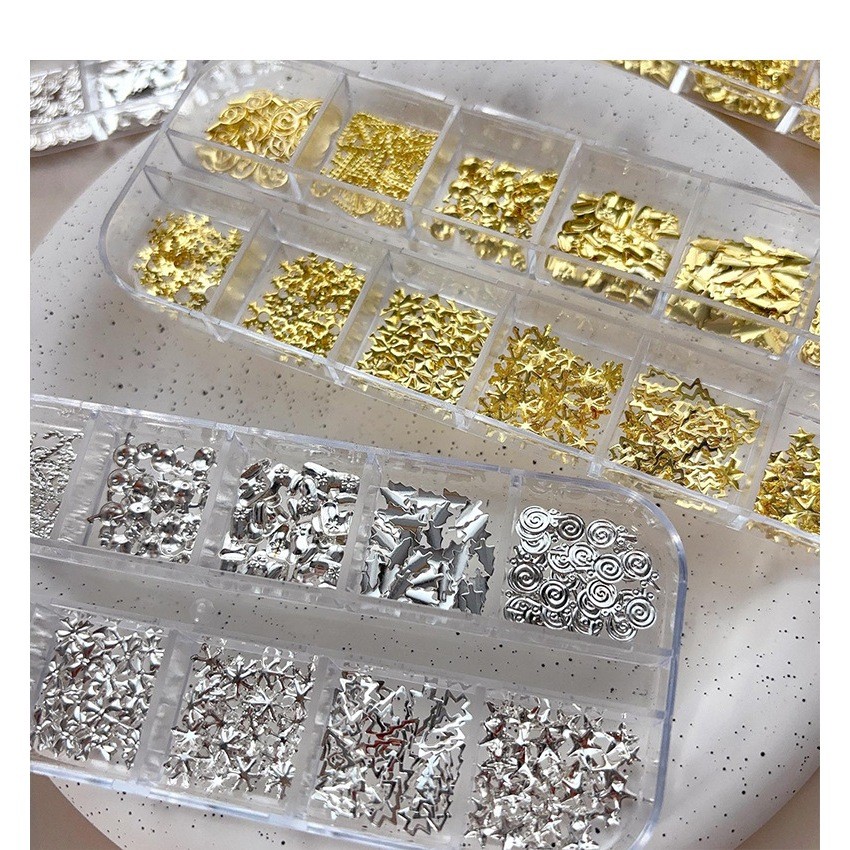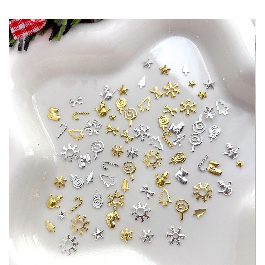 Hiasan Kuku Aksesori Kuku Logam Tema Natal: Pohon, Salju, Permen, Kaus - Emas & Perak, 12 Slot/Kotak