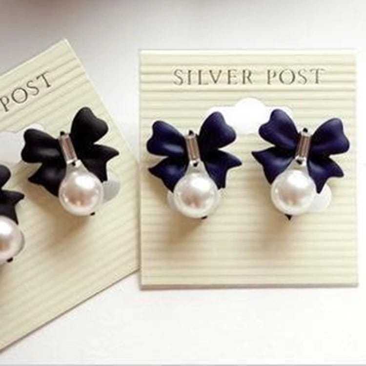 Anting Bentuk Ribbon Navy Blue Mutiara Pita Manik fashion Wanita Model Korea Terbaru Imut Lucu