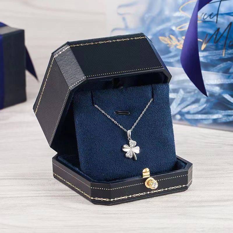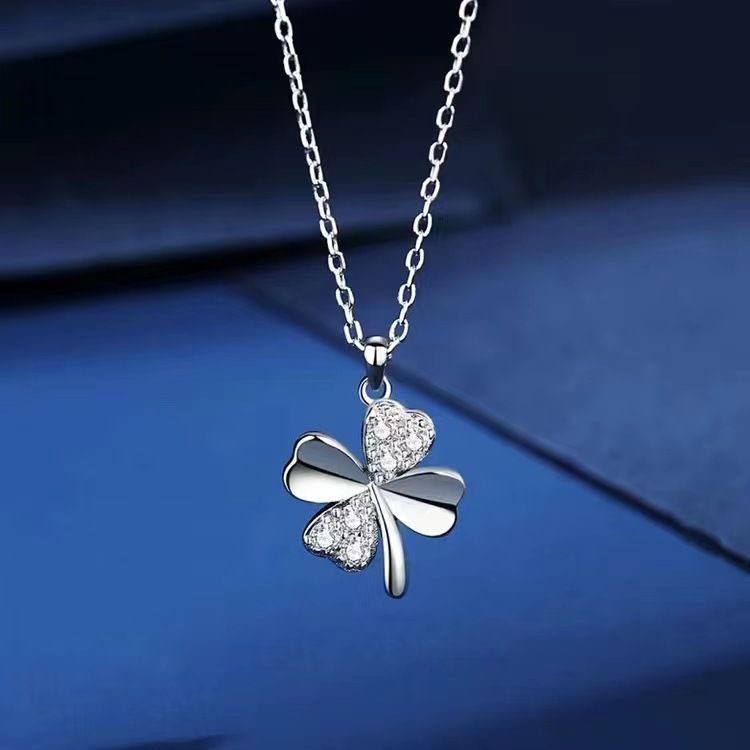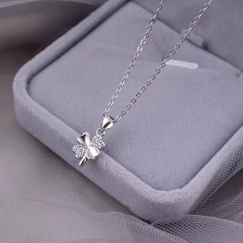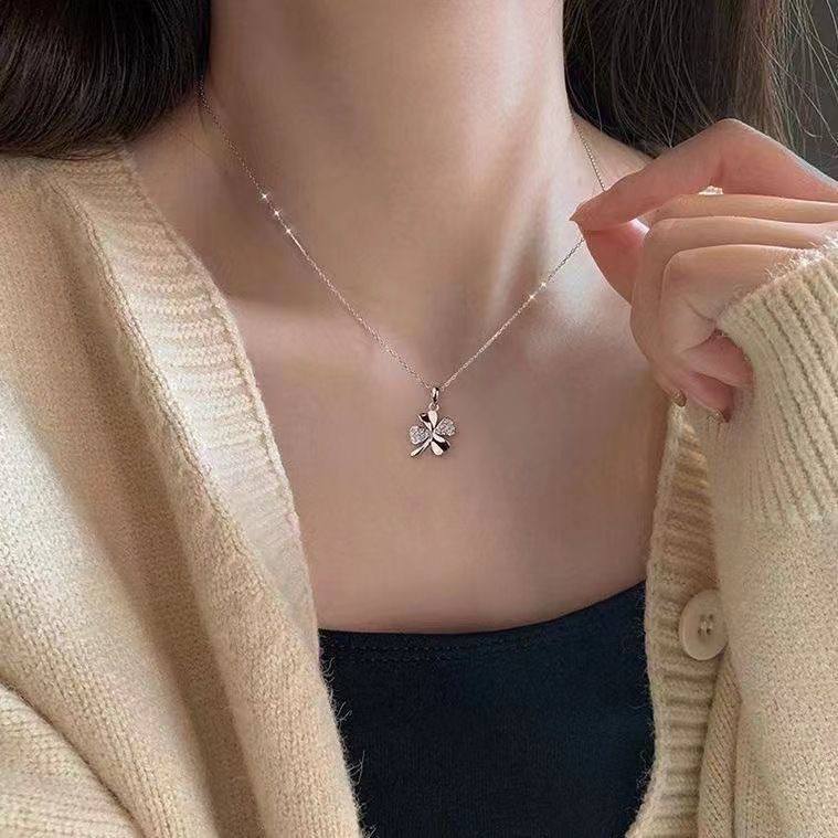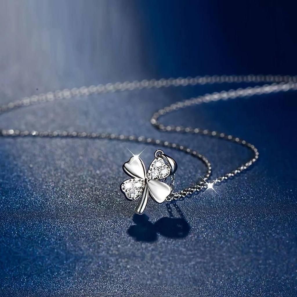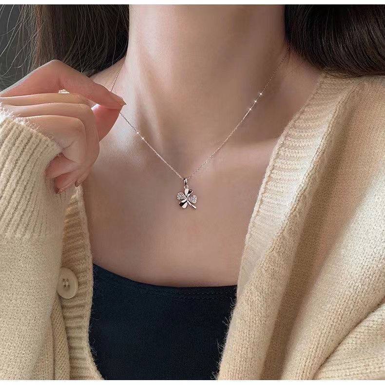 Kalung Titanium Wanita Silver Mewah Liontin Daun Semanggi Empat Daun Cantik Elegan Hadiah Spesial