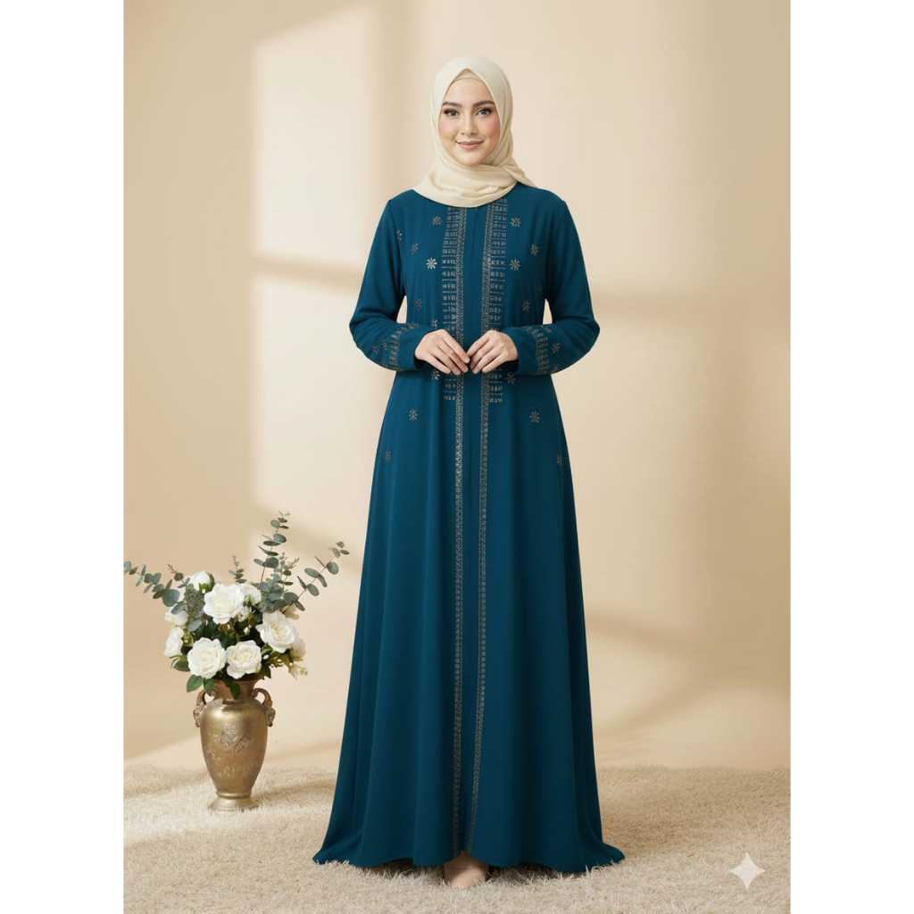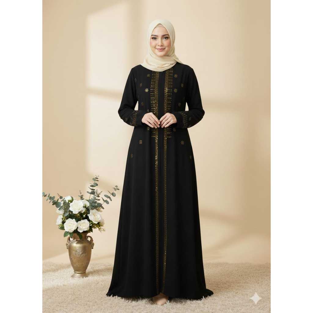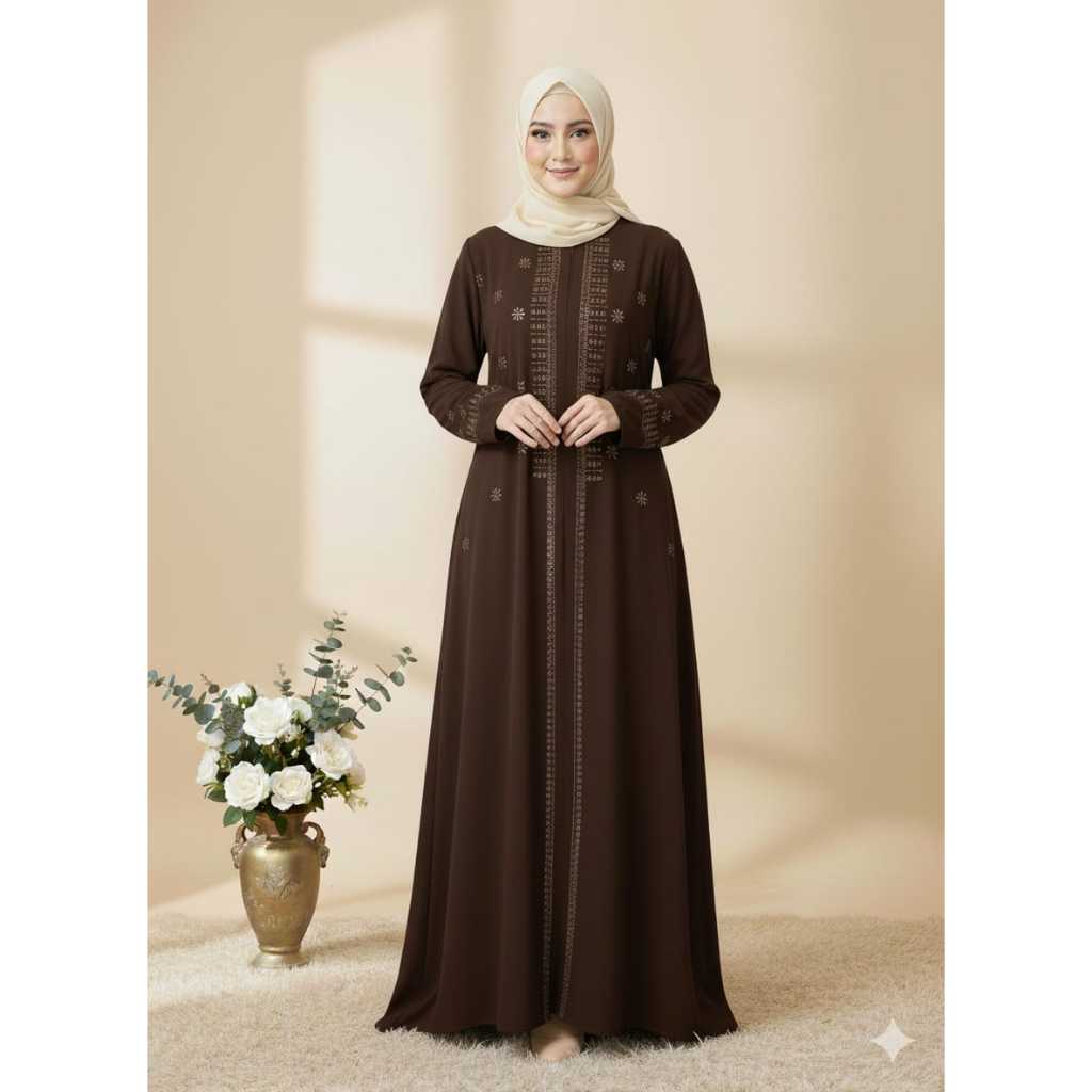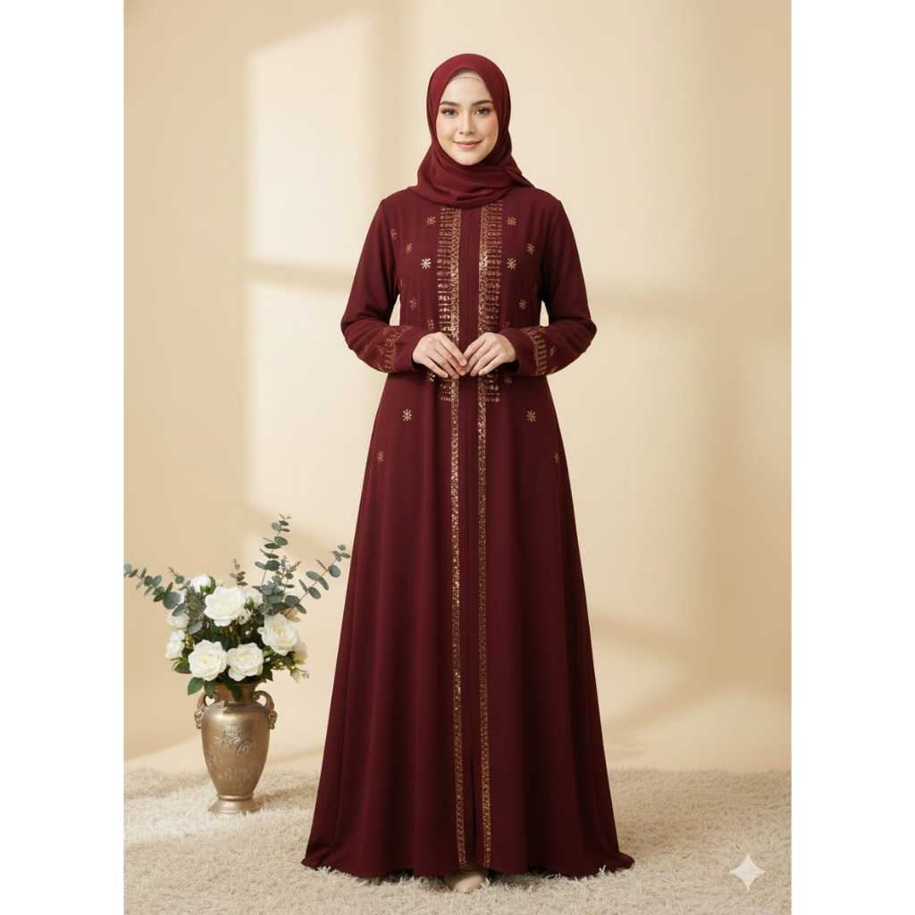 Abaya Lebaran Amira Maxy Bahan Sabrina Premium Anti UV Dengan Aksen Manik Manik Cantik Warna Maroon Elegan Size