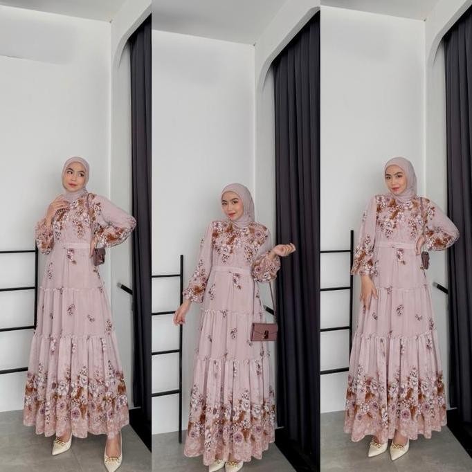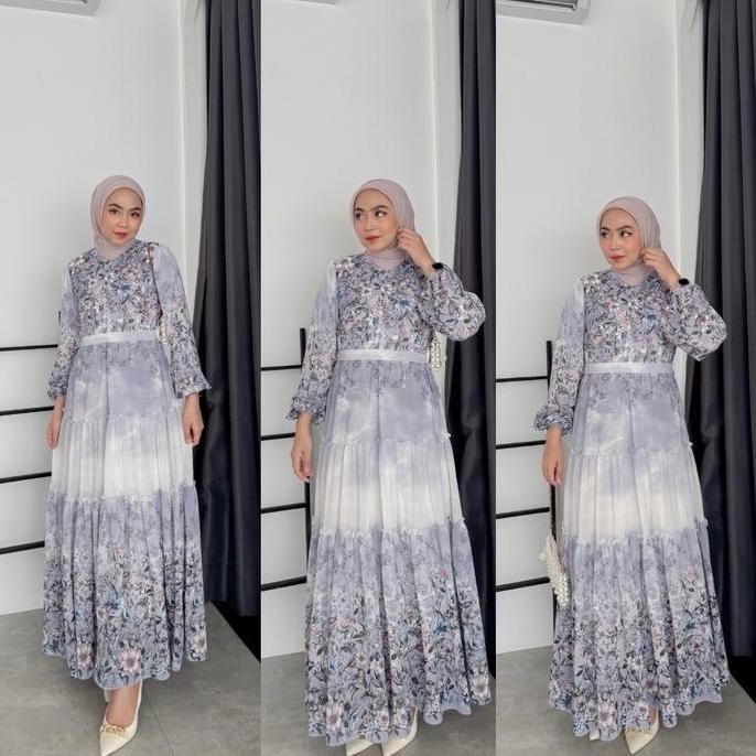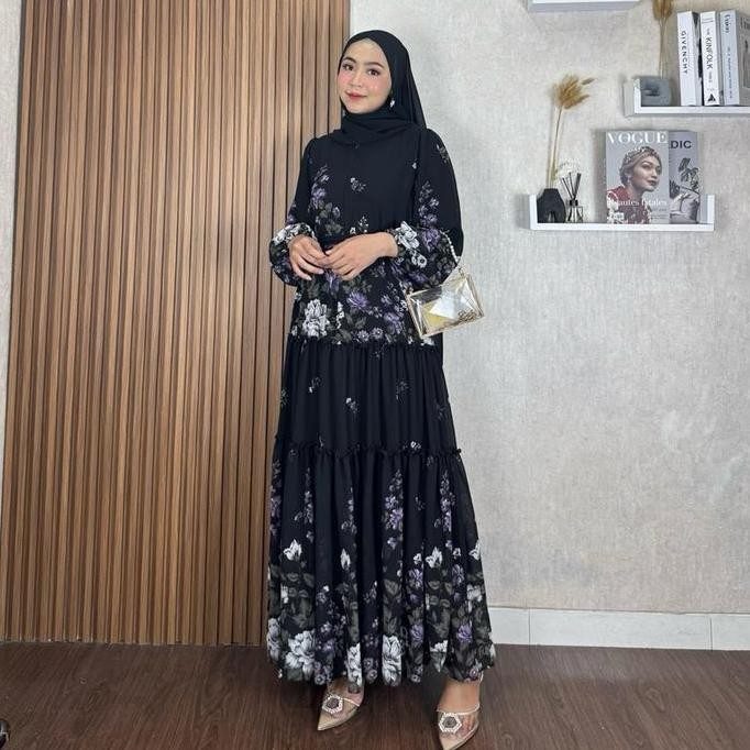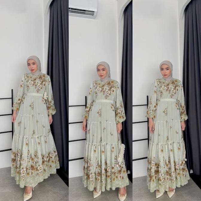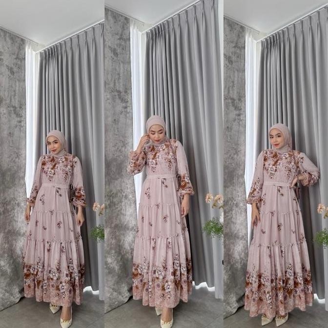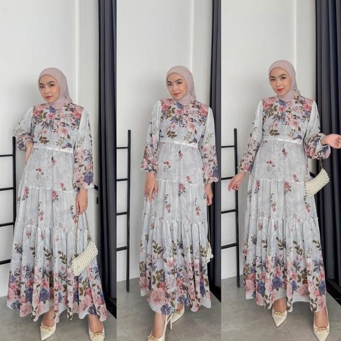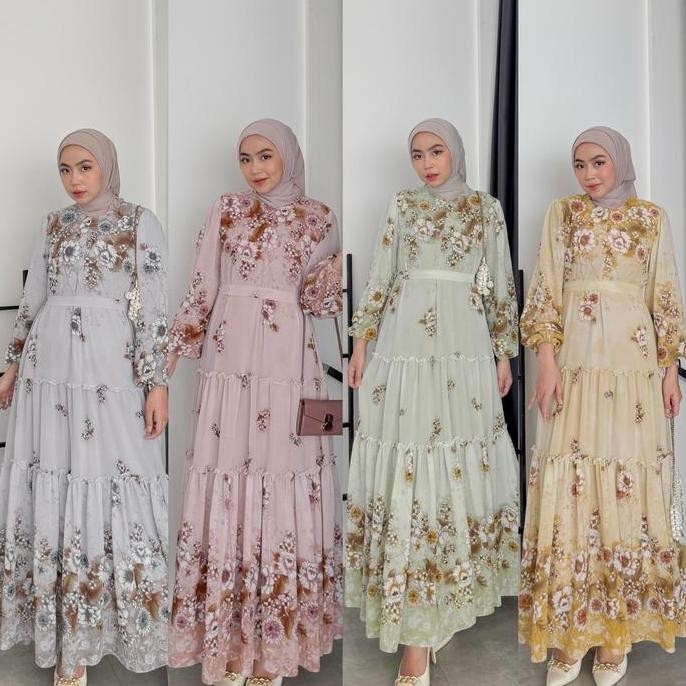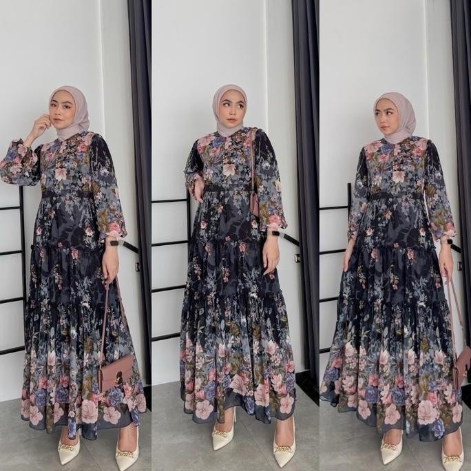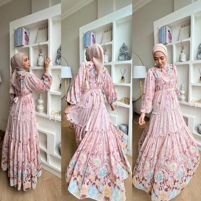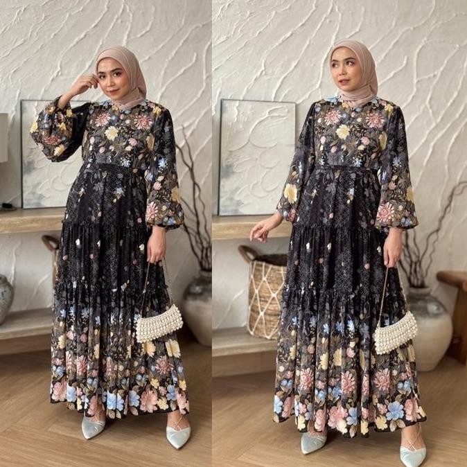 Hiladira Miskha Dress Ceruty Gamis Maxi Syari Kondangan Baju Lebaran Muslimah Wanita Motif Bunga Pesta Simple Mewah Remaja Gaun Wanita