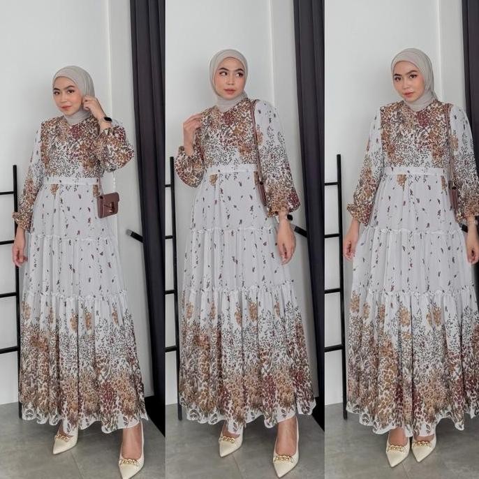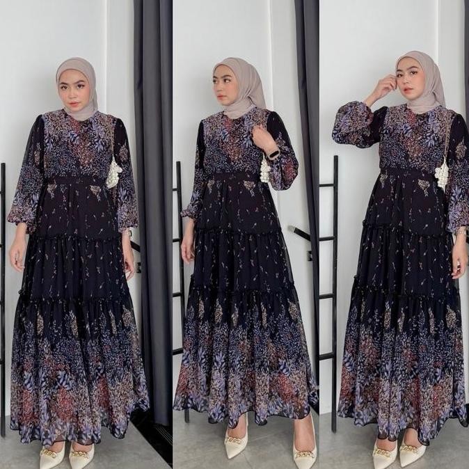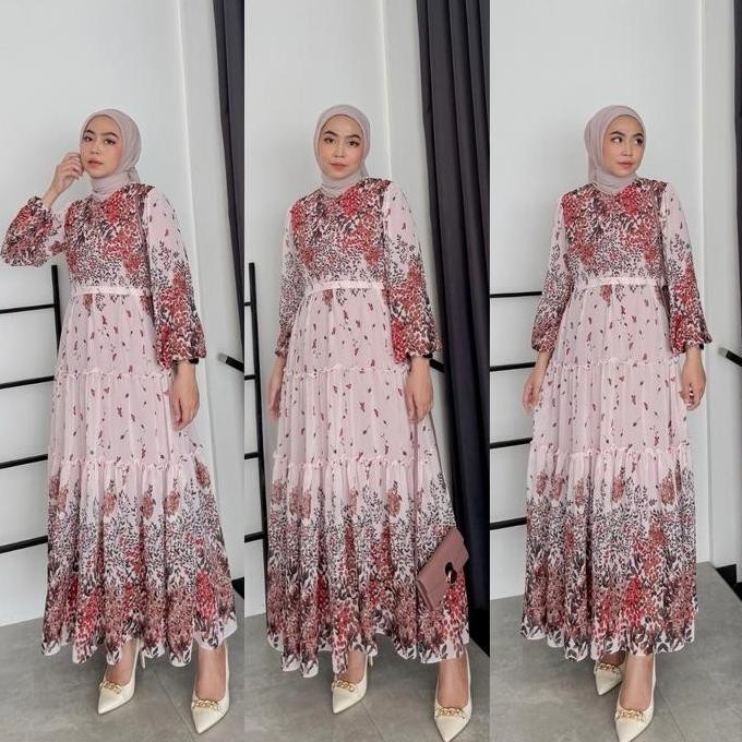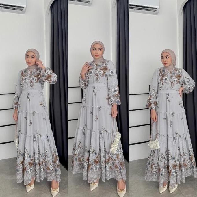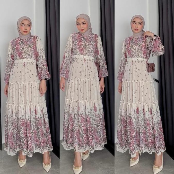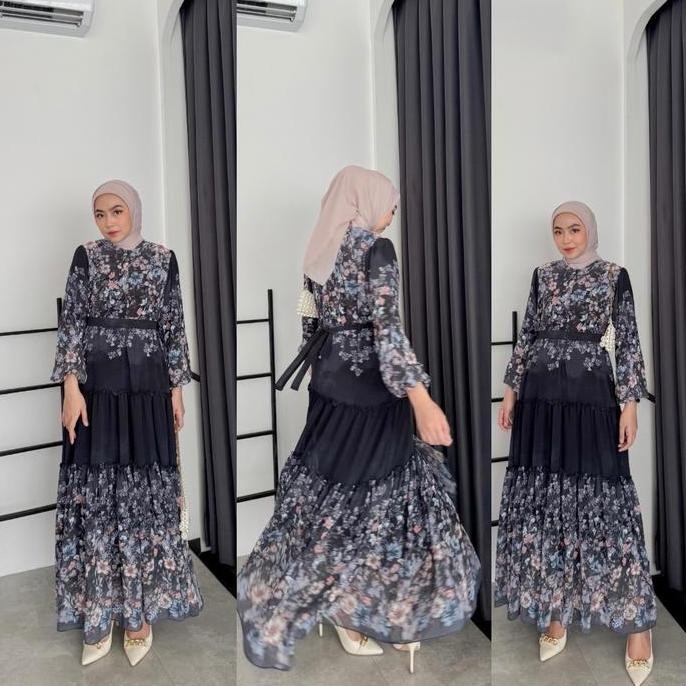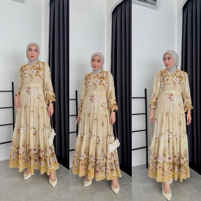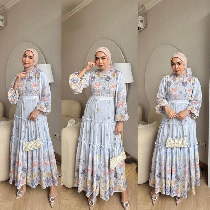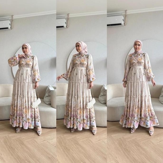 Hiladira Miskha Dress Ceruty Gamis Maxi Syari Kondangan Baju Lebaran Muslimah Wanita Motif Bunga Pesta Simple Mewah Remaja Gaun Wanita