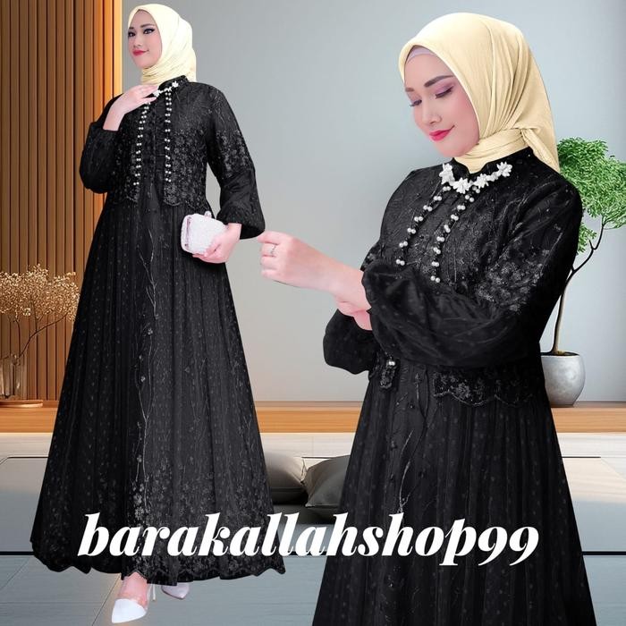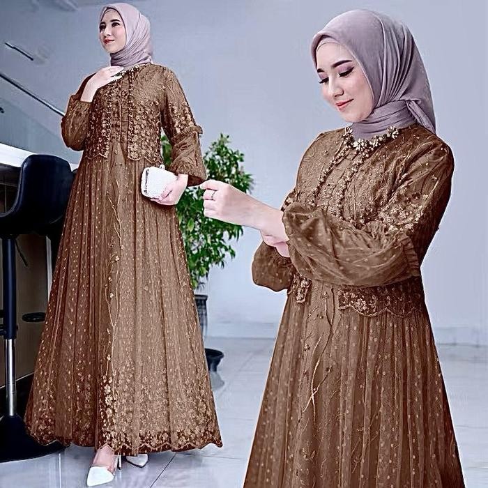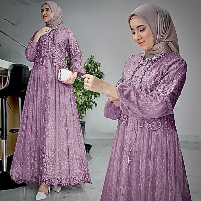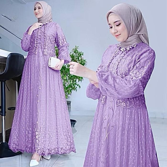 Dress Friska Pakaian Wanita Kekinian Gamis Kondangan Tulle Dresses Busui Friendly Gamis Simple Baju Muslim Jumbo Maxi Lebaran - Lilac Gelap, M-Ld 90cm